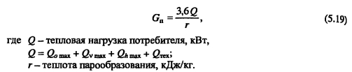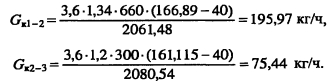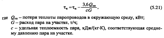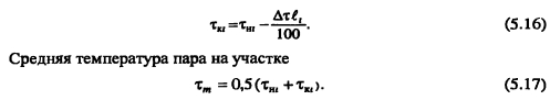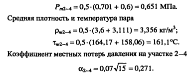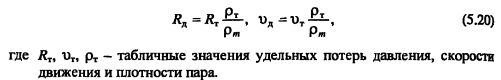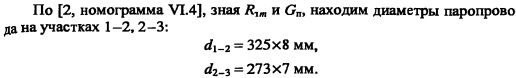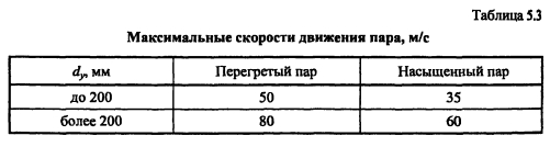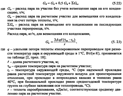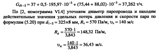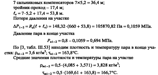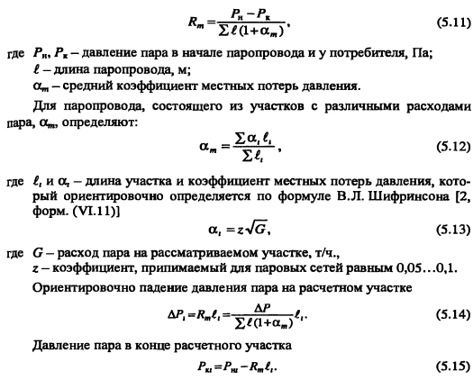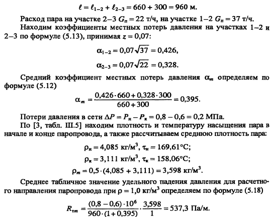Гидравлический расчет паропроводовЗадачей гидравлического расчета паропроводов является определение диаметров трубопроводов и потерь давления по участкам, исходя из расчетного расхода пара, располагаемого перепада давления ДР (разности давления пара в начале Рн и конце Рк паропровода) с учетом изменения плотности пара и вследствие падения давления и изменения температуры пара т за счет потерь теплоты в окружающую среду. Поскольку падение давления и потери теплоты на каждом участке паропровода зависят от его диаметра, который является искомой величиной, то гидравлический расчет состоит из двух этапов: предварительного и окончательного. В предварительном расчете считают, что потери давления по длине паропровода происходят равномерно. Тогда среднее удельное линейное падение давления находят по [2, форм. (VI. 10)] ![]() Гидравлический расчет паропроводов производят по средней плотности пара на расчетном участке, которую определяют с учетом падения давления и температуры пара за счет потерь теплоты в окружающую среду. В предварительном расчете падение температуры перегретого пара на каждые 100 м принимают Ат = 2,0.. .2,5°С. Температура пара в конце расчетного участка ![]() Диаметр паропровода находят по расчетному расходу пара и величине среднего удельного падения давления Rm по таблицам или номограммам, составленным при 0,2 мм. При этом плотность пара в таблицах или номограммах р, отличается от рт на рассматриваемом участке. Поэтому предварительно находят табличные значения средней удельной потери давления [2, форм. (VI.22)] ![]() Расчетный расход пара Gy, согласно [1, п. 5.6] должен определяться с учетом несовпадения максимальных часовых расходов пара отдельными потребителями. При отсутствии суточных графиков расхода пара допускается расчетный расход пара определять с коэффициентом 0,9. Расход пара, т/ч, отдельными потребителями ![]() При окончательном расчете находят действительные значения удельных потерь давления и скорости пара ![]() Диаметр паропровода должен быть подобран так, чтобы скорость движения пара не превышала значений, указанных в таблице 5.3. ![]() Зная из предварительного расчета диаметр паропровода, определяют эквивалентную длину местных сопротивлений и действительные потери давления на участках. Действительная температура перегретого пара в конце расчетного участка ![]() При т выше температуры насыщения пара, соответствующей давлению конденсации пара не будет. Если при окончательном расчете средняя плотность пара на участке оказалась близкой к рт, из предварительного расчета, и давление в конце паропровода Рк приблизительно равно заданному значению, то расчет можно считать законченным. В противном случае необходимо изменить диаметр паропровода и расчет повторить. Расчет паропроводов насыщенного пара. Согласно [1, п. 5.6] при расчете паропроводов насыщенного пара в суммарном расчетном расходе пара необходимо учитывать дополнительное количество пара для возмещения его конденсации. Тогда расчетный расход пара Gd на участке паропровода ![]() ПРИМЕР 5.5. Определить диаметр паропровода, схема которого показана на рис. 5.10. Исходные данные: начальное давление пара 0,8 МПа, давление пара у потребителей 0,6 МПа. Паропровод проложен в не- проходном канале, температура воздуха в котором 40°С. Расход пара потребителем, потребителем 15 т/ч. 