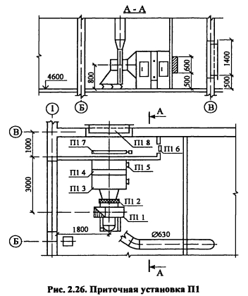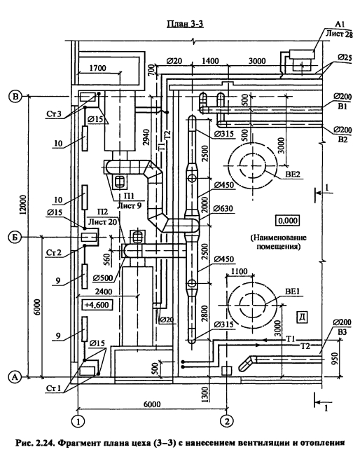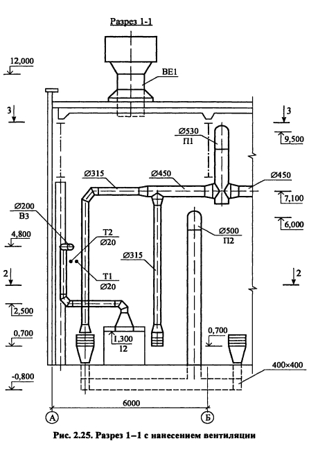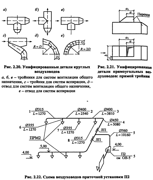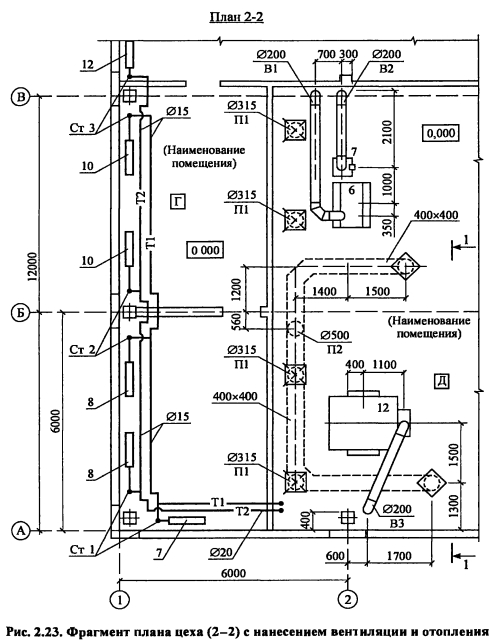 Исходные данные для выполнения проекта, оформление, выбор расчетных данныхЦелью курсового проекта является рассчитать и запроектировать системы вентиляции промышленного здания в соответствии с действующими Строительными нормами и правилами (СНиП), указаниями по проектированию (СН), техническими условиями (ТУ) на монтаж и эксплуатацию систем отопления и вентиляции. Исходные данные для выполнения проекта: план цеха и конструктивные особенности ограждений; перечень технологического оборудования, высота цеха; название города, в котором расположено здание; ориентация здания по сторонам света; параметры теплоносителя и др. Пояснительная записка курсового проекта включает: - введение (краткое описание проектируемого объекта и конструктивных особенностей здания); - описание технологического процесса и характеристику выделяющихся вредностей; - выбор расчетных параметров наружного и внутреннего воздуха для холодного, теплого периодов и переходных условий, теплотехнический расчет ограждающих конструкций и расчет тепло- потерь здания, - определение количества вредностей (теплоты, влаги и вредных веществ), поступающих в помещение, для трех периодов года, - составление теплового баланса и выбор системы отопления, - определение типа и производительности местных отсосов от технологического оборудования, - определение воздухообмена по вредностям, - расчет раздачи приточного воздуха, - аэродинамический расчет одной приточной и одной вытяжной системы, -подбор вентиляционного оборудования (фильтра, калорифера, вентилятора), - расчет воздушно-тепловой завесы В графической части должны быть представлены план и разрез здания с нанесением технологического оборудования и систем вентиляции, аксонометрические схемы рассчитанных систем, план и разрез приточной камеры с нанесением оборудования, его спецификация План цеха с нанесением воздуховодов, технологического и вентиляционного оборудования выполняется в М 1 100, М 1 200 На план наносят названия помещений, номера позиций технологического оборудования, местные отсосы, обозначение вентиляционных систем В соответствии с ГОСТ [27] приняты следующие обозначения П - приточная система с механическим побуждением, В - вытяжная система с механическим побуждением, ПЕ - приточная система с естественным побуждением, BE - вытяжная система с естественным побуждением, У - воздушные завесы, А - агрегаты отопительные К обозначениям добавляют порядковый номер системы, например П1, П2, Bl, ВЕ1, АЗ, У2 Элементы и оборудование систем вентиляции вычерчиваются в масштабе в виде упрощенных графических изображений Фасонные части воздуховодов приведены на рис 2 20 и 2 21 Контуры воздуховодов и отопительно-вентиляционного оборудования изображают на плане сплошными толстыми основными линиями, строительные конструкции - сплошными тонкими, невидимые контуры шахт, дефлекторов, крышных вентиляторов - утолщенными штрих-пунктирными, подпольные каналы и приямки - штриховыми линиями На планы и разрезы наносят координатные оси здания и расстояния между ними Кроме того, наносят отметки чистых полов этажей и основных площадок, привязки к координатным осям или элементам строительных конструкций вентиляционных установок, воздуховодов, технологического оборудования, диаметры воздуховодов и сечений каналов, категории про