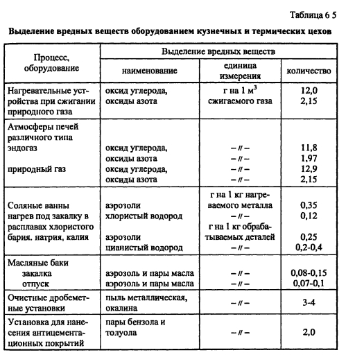 Кузнечно-прессовые и термические цехаК основному оборудованию кузнечно-прессовых и термических цехов относятся нагревательные печи, работающие на газе и мазуте, электротермические печи и ванны, закалочные баки, ковочные и штамповочные машины, дробеструйные камеры и галтовочные барабаны, зачистные станки При сжигании газа и мазута в нагревательных печах происходит выделение оксидов азота, углерода, серы. В отходящих газах может присутствовать пыль и сажа за счет зольности мазута, недожога топлива, загрязнения металла в садке, а также за счет его угара. Кроме того, к наиболее распространенным загрязнениям воздуха в термических цехах относятся пары масел, пары расплавов солей, щелочи и другие вещества. Вентиляционный воздух, аспирируемый от дробеструйных камер, галтовочных барабанов, содержит пыль в виде окалины. Вентиляционный воздух, аспирируемый от наждачных станков, соответствует данным для аналогичного оборудования цехов механической обработки материалов. Количественные характеристики наиболее распространенных в машиностроительной отрасли источников выделений вредных веществ в кузнечно-прессовых и термических цехах представлены в таблице 6.5. ![]() |