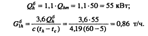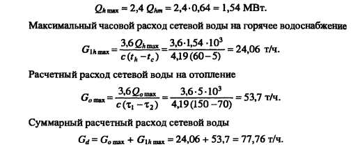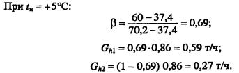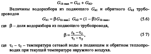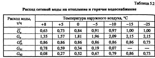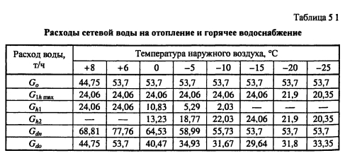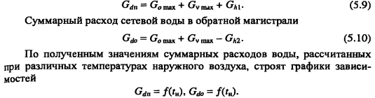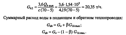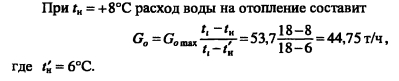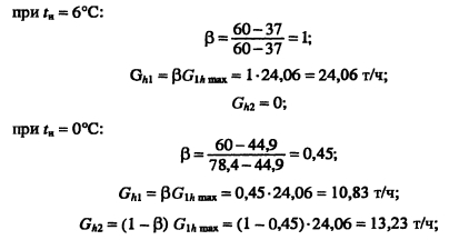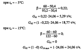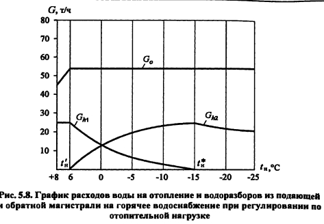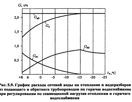 Методика построения графиков регулирования для открытых систем теплоснабженияДля открытых систем теплоснабжения в расчет и построение графиков регулирования входят: графики температур воды после систем отопления и вентиляции, расходов сетевой воды на отопление и вентиляцию, водоразборов из подающей и обратной магистралей на горячее водоснабжение, суммарного расхода сетевой воды в подающей и обратной магистралях. При центральном качественном регулировании отпуска теплоты по отопительной нагрузке, когда местные системы отопления и горячего водоснабжения присоединяются к тепловым сетям по принципу несвязанной подачи теплоты, расчет и построение графиков регулирования отопительной и вентиляционной нагрузок аналогичен графикам регулирования в закрытых системах теплоснабжения. Единственное отличие - в связи с непосредственным водоразбором на горячее водоснабжение отопительнобытовой температурный график имеет срезку на 60°С, а не на 70°С, как для закрытых систем. Графики водоразборов на горячее водоснабжение. Расход сетевой воды на горячее водоснабжение Gihmax определяют по формуле (4.38). Он представляет сумму водоразборов из подающего и обратного Ghi теплопроводов ![]() Водоразбор на горячее водоснабжение только из подающего теплопровода осуществляется в диапазоне температур наружного воздуха +8°С, когда Ti = const = 60°С, при этом повышением температуры сетевой воды в подающей магистрали к водоразбору из подающего теплопровода добавляется водоразбор из обратной линии, который увеличивается с повышением т2. При т2 = 60°С водоразбор из подающего теплопровода прекращается и на горячее водоснабжение вода поступает только из обратного теплопровода max При т2 > 60°С расход воды на горячее водоснабжение снижается, его значение при t0 определяется по формуле ![]() Определив водоразбор из подающего и обратного теплопроводов при различных емпературах наружного воздуха, строят графики зависимостей Ghl =/(/н). Ghl =Лн)- ПРИМЕР 5.3. Построить графики расхода сетевой воды на отопление и горячее водоснабжение (водоразборов из подающего и обратного теплопроводов) для жилых зданий, присоединенных к открытой тепловой сети, при регулировании отпуска теплоты по отопительной нагрузке. Расчетные расходы теплоты на отопление 5 МВт, горячее водоснабжение Qhm = 0,64 МВт, температура горячей воды в системе горячего водоснабжения th = 60°С; холодной tc = 5°С. Температуру сетевой воды в подающей ij и обратной т2 магистралях принять по отопительно-бытовому температурному графику (рис. 4.3) с учетом того, что минимальная температура воды в подающем теплопроводе 60°С, а температура наружного воздуха в точке излома графика = 6°С. Решение. Находим максимальный часовой расход теплоты на горячее водоснабжение ![]() В диапазоне температур наружного воздуха +8...10, когда у потребителей осуществляется регулирование отпуска теплоты на отопление местными пропусками, расход сетевой воды на отопление в тепловых сетях уменьшается. ![]() Расход сетевой воды на горячее водоснабжение представляет сумму водоразборов из подающего и обратного теплопроводов ![]() ![]() В диапазоне температур наружного воздуха +8...+6°С (+6°С - температура наружного воздуха в точке излома температурного графика) водоразбор на горячее водоснабжение осуществляется только из подающего теплопровода (Р - доля водоразбор
