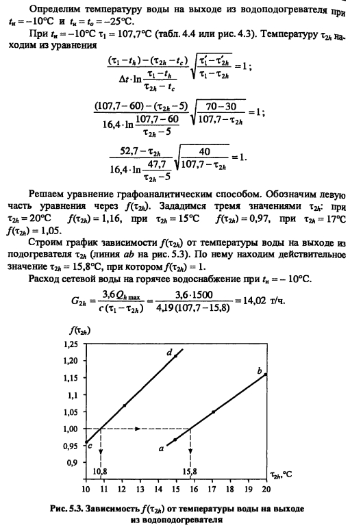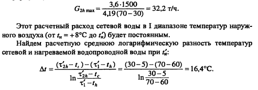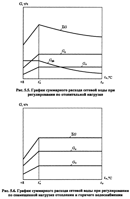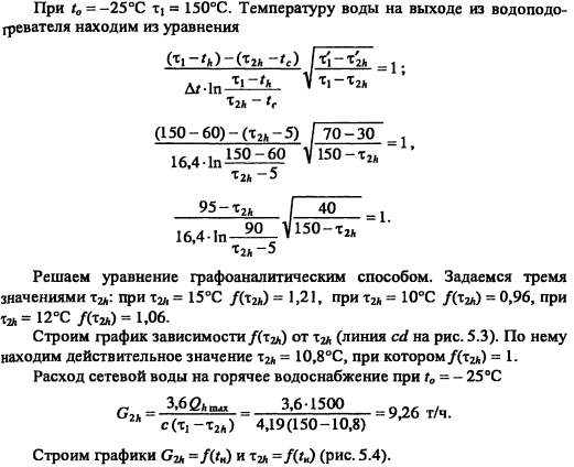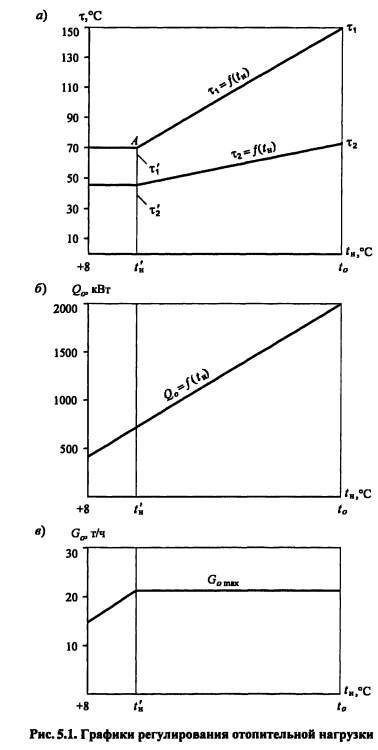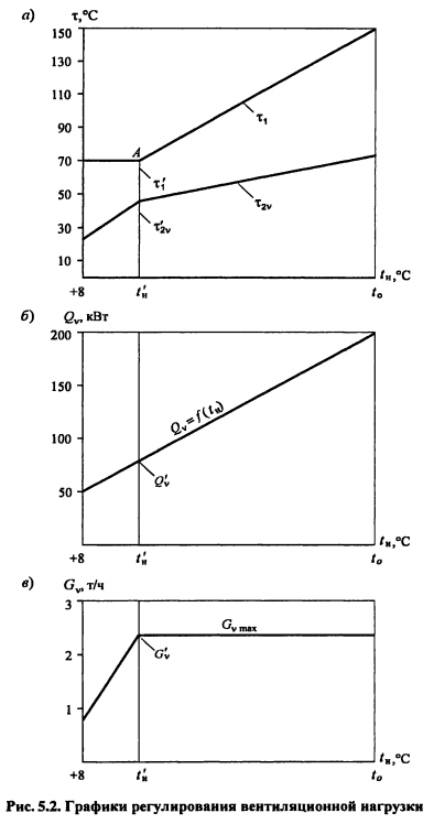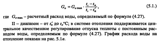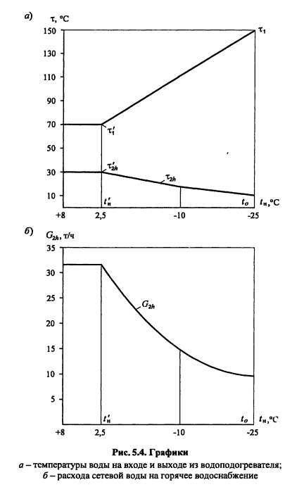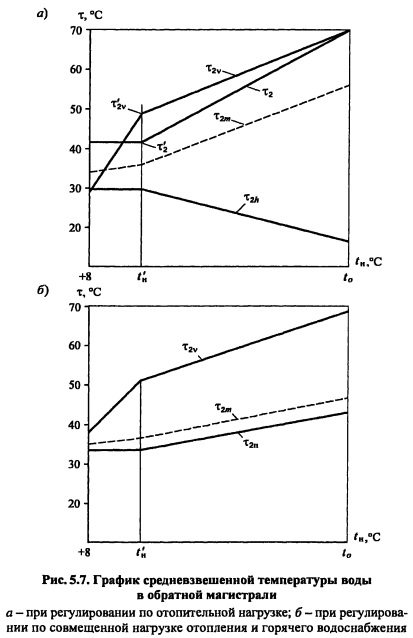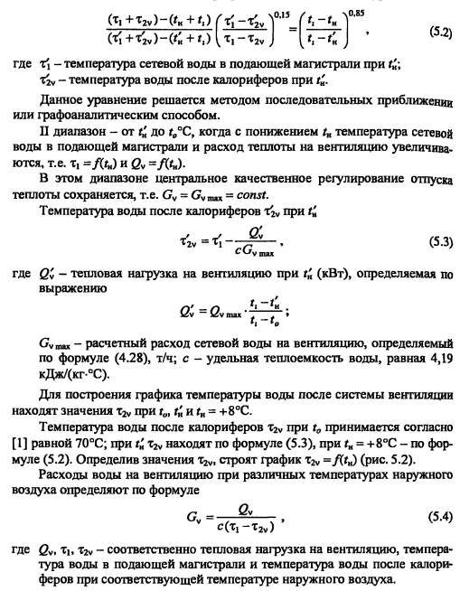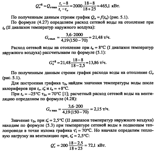 Методика построения графиков регулирования для закрытых систем теплоснабженияВ целях качественного теплоснабжения разнородных потребителей центральное регулирование отпуска теплоты дополняется местным количественным Для систем с центральным регулированием по совмещенной нагрузке отопления и горячего водоснабжения, когда расчетный расход сетевой воды в тепловых сетях определяется суммой расходов воды на отопление и вентиляцию Gd= Gojaax +Gvmax без учета нагрузки горячего водоснабжения, в расчет и построение графиков регулирования входят графики температуры воды после систем отопления и вентиляции, графики расходов теплоты и воды на отопление и вентиляцию, суммарный график расхода воды, график средневзвешенной температуры воды в обратном теплопроводе Если центральное качественное регулирование отпуска теплоты осуществляется по отопительной нагрузке, когда расчетный расход сетевой воды в тепловых сетях определяется суммой расходов воды на отопление, вентиляцию и горячее водоснабжение (форм (4 33), в расчет и построение графиков регулирования входят также графики температуры воды после водоподогревателя и расхода воды на горячее водоснабжение Графики регулирования отопительной нагрузки. Задачей регулирования является определение температуры воды после системы отопления т2, расходов теплоты Q0 и воды G0 на отопление при различных температурах наружного воздуха Точка излома делит весь отопительный период на два диапазона: I - от +8°С до г-, когда = const и регулирование отопительной нагрузки осуществляется обычно местными пропусками. Число часов ежесуточной работы системы отопления в этот период определяют по формуле ![]() Расход сетевой воды через любую местную систему отопления в течение всего отопительного периода поддерживается с помощью регулятора расхода (РР) постоянным, равным расчетному. В период, когда осуществляют местное регулирование пропусками, число одновременно включенных систем отопления с повышением г- уменьшается. Суммарный расход сетевой воды на отопление в этом диапазоне температур наружного воздуха определяют по выражению ![]() Графики регулирования вентиляционной нагрузки. Регулирование отпуска теплоты на вентиляцию можно осуществить изменением расхода сетевой воды или нагреваемого воздуха. Если заданием не определен способ регулирования отпуска теплоты на вентиляцию, применяют способ регулирования изменением расхода сетевой воды. В этом случае задачей расчета регулирования является определение температуры воды после калориферов расхода теплоты Qv и сетевой воды на вентиляцию Gv при различных температурах наружного воздуха. Построение графика расхода теплоты на вентиляцию см. пример 4.2 (рис. 5.2.). На основании графиков расхода теплоты на вентиляцию и температуры воды в подающей магистрали Ti = f(tH) весь отопительный период можно разбить на два диапазона (рис. 5.2.): ![]() ![]() Температуру воды после калориферов T2V определяют из уравнения ![]() По рассчитанным значениям расхода сетевой воды на вентиляцию строят график Gv (см. рис. 5.2). ПРИМЕР 5.1. Построить графики регулирования для систем отопления и вентиляции при следующих данных: С?-тах = 2000 кВт, Qv max = 200 кВт, расчетная температура наружного воздуха для проектирования отопления t0 = -25°С, температура воздуха в помещении f,= 18°С. Центральное регулирование