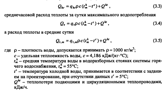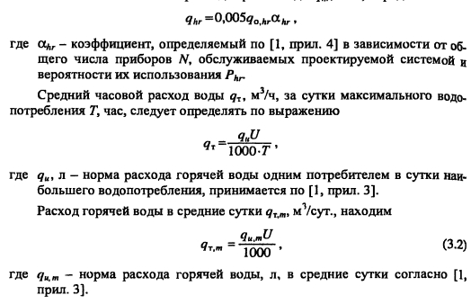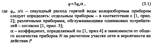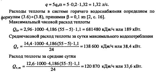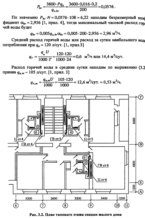Определение расчетных расходов горячей воды и теплотыМаксимальный секундный расход воды на расчетном участке сети, при гидравлическом расчете теплопроводов системы горячего водоснабжения определяем по формуле ![]() Вероятность действия санитарно-технических приборов на участках сети при одинаковых водопотребителях в здании без учета изменения U/N находим из выражения ![]() Вероятность использования санитарно-технических приборов Phl для системы в целом определяем по формуле ![]() Максимальный часовой расход горячей воды qhn м3/ч, определяем ![]() Расход горячей воды используют при выполнении техникоэкономических сравнений вариантов. Максимальный часовой расход теплоты Qhn кДж/ч, системой горячего водоснабжения следует определять по формуле ![]() На начальном этапе проектирования систем горячего водоснабжения диаметры и длина теплопроводов еще неизвестны, поэтому точное определение потерь теплоты в них невозможно. Согласно 2, с. 15... 16], Qht оценивается ориентировочно, в долях (коэффициент (3) от расхода теплота на подогрев среднечасового расхода воды до нормативной температуры, т.е. ![]() Значение 3 зависит от протяженности системы горячего водоснабжения и ее мощности. Для изолированных водоразборных стояков Р = 0,05-5-0,2, для неизолированных (3 = 0,1-5-0,3. Максимальный часовой расход теплоты Qhr принимается при расчете площади поверхности теплообмена водоподогревателей; среднечасовой расход теплоты Qr - при определении необходимого запаса теплоты в аккумуляторе и при расчете потребления теплоты системой горячего водоснабжения, QTm - при технико-экономических расчетах. ПРИМЕР 3.1. Определить расчетные расходы воды и теплоты на горячее водоснабжение 36-квартирного 6-этажного жилого дома, состоящего из двух секций. Система горячего водоснабжения подключена к тепловым сетям по закрытой схеме. Приготовление горячей воды осуществляется в центральном тепловом пункте микрорайона (квартала). В каждой квартире установлена следующая водоразборная арматура: смеситель мойки на кухне, смеситель ванны и умывальника. План типового этажа секции здания приведен на рис. 3.2. Решение Полагая, что в 3-комнатной квартире проживает 4 человека, а в 2-комнатной - 3, определяем общее число потребителей горячей воды ![]() Вероятность использования санитар но-технических приборов в системе, принимая Общее количество водоразборных приборов в здании N= 3 -36 = 108. Вероятность действия водоразборных приборов системы горячего водоснабжения определяем исходя из нормы расхода горячей воды на 1 человека в час наибольшего водопотребления qhriU = 10 л/ч [1, прил. 3] и секундного расхода воды одним прибором qa = 0,2 л/с [1, прил. 3] ![]() ![]() Для установления максимального секундного расхода воды в системе горячего водоснабжения при гидравлическом расчете находим предварительно по [1, прил. 4] безразмерный коэффициент а = 1,32, соответствующий произведению P-N = 0,016-108 = 1,73. Секундный расход горячей воды водоразборным прибором принимаем по [1]. ![]() |