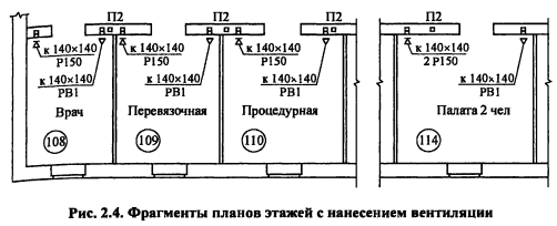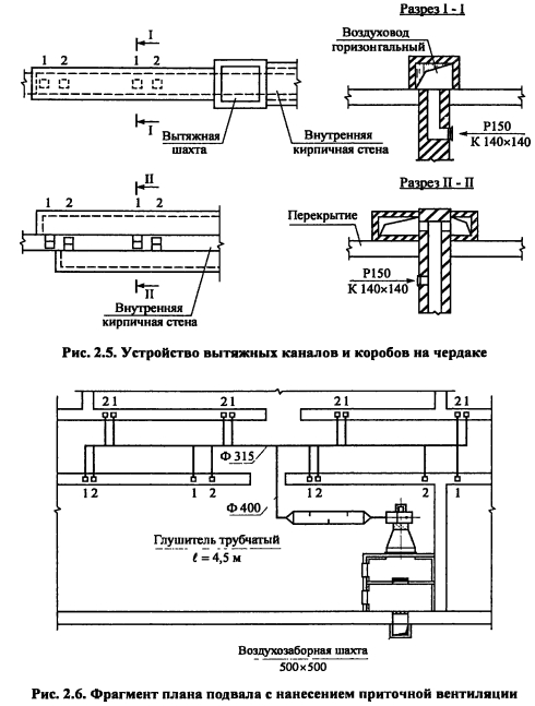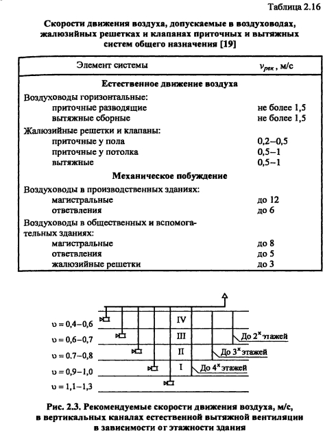 Организация воздухообмена в помещениях, расчет количества и размещение вентиляционных каналов на планах зданияЭффективность общеобменной вентиляции в значительной степени зависит от способа и равномерности раздачи приточного воздуха в помещении и удаления отработавшего. Наилучшим вариантом организации воздухообмена является такой, при котором в помещении нет застойных зон. Это достигается равномерным размещением приточных и вытяжных каналов раздельно в противоположных стенах. При необходимости размещения каналов в плоскости одной стены желательно проектировать их максимально удаленными друг от друга. Для увеличения расчетной «рабочей разности температур воздуха», подаваемого в помещение, выпуск приточного воздуха следует осуществлять на отметке 2,5 м и выше от уровня пола. Вытяжные каналы открываются на расстоянии 0,5 м и ниже плоскости потолка. Вентиляционные вертикальные каналы (размерами 140x140 мм, 140x270 мм) можно размещать во внутренних кирпичных стенах здания. Приставные вентиляционные каналы в помещениях могут выполняться из плит гипсошлаковых, шлакобетонных, гипсоволокнистых, пеноглинистых и пеностеклянных, а также из асбестоцементных готовых изделий и других материалов. Размеры поперечных сечений воздуховодов из различных материалов принимают на основании данных заводов-изготовителей. Площадь поперечного сечения каналов, воздуховодов, живого сечения воздухораспределителей, м2 ![]() Рекомендуемые значения скорости приведены в табл. 2.16. В зависимости от этажности здания в каналах соответствующих этажей при естественном побуждении движения воздуха значения скоростей принимают по схеме, приведенной на рис. 2 3. ![]() ПРИМЕР 2.11. Рассчитать площадь сечения вертикальных каналов и жалюзийных решеток, устанавливаемых на них, для помещений больницы (пример 2.10). Здание двухэтажное, кирпичное, с чердаком и подвалом. Расчет производим по формулам (2.28-2.30). Результаты расчетов сводим в табл. 2.17. ![]() Вентиляционные каналы проектируются во внутренних кирпичных стенах. Примерное размещение приточных и вытяжных каналов приведено на рис. 2.4. ![]() ![]() При размещении каналов на планах этажей соблюдается их строго вертикальное положение. Разноименные каналы в помещении желательно располагаются на возможно большем расстоянии друг от друга. На рис 2.5, 2.6 показано размещение каналов приточно-вытяжной вентиляции в помещениях здания, а также на чердаке и в подвале. ![]() При размещении вентиляционных каналов на планах необходимо соблюдать следующие требования. 1. Максимальное расстояние между одноименными кирпичными каналами - 140 мм, между разноименными (приток-вытяжка) - 270 мм, между каналом и дверным проемом - 410 мм. 2 Не размещать каналы в местах пересечения капитальных степ 3 Вытяжные каналы из помещений выводить на чердак самостоятельно без отступлений в плане При наличии подвальных и чердачных помещений в здании приточные камеры, как правило, размещаются в подвале, вытяжные камеры и шахты - на чердаке В этом случае все вертикальные каналы, нанесенные на плане подвала, объединяются магистральным воздуховодом, уточняется место расположения приточной камеры и воздухозаборной шахты Воздухозаборная шахта и приточная камера обычно располагаются со стороны дворового фасада При этом приточную камеру, как источник шума, нужно разме