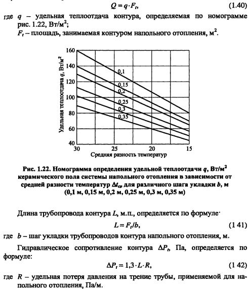 Особенности теплового и гидравлического расчета систем напольного отопленияОсобенности конструирования напольного отопления частично описаны в разделе 1.4.5. Наиболее распространенными в использовании являются керамические полы напольного отопления, для которых на рис. 1.22 приведена номограмма теплового расчета. Из-за тепловой инерционности напольного отопления и связанного с этим значительного запаздывания в регулировании, рекомендуем применять напольное отопление комплексно с радиаторным, разделяя между ними тепловую нагрузку помещения. Средняя разность температур определяется из выражения: ![]() Рекомендуется принимать следующие расчетные параметры tz!t0\ 55/45, 50/40, 45/35,40/30°С. Тепловой поток контура Q, Вт, напольного отопления определится из выражения: ![]() ПРИМЕР 1.9. Для контура напольного отопления керамического пола определить тепловой поток и гидравлическое сопротивление. Исходные данные площадь контура F, - 24 м2; расчетные параметры теплоносителя в контуре 45/35°С; расчетная температура воздуха tp = 20°С, трубы металлополимерные 018x2 мм укладываются с шагом 0,25 м. По номограмме рис. 1.22 для Atcp = (45 + 35)/2 - 20 = 20°С при шаге 0,25 м получаем удельную теплоотдачу q = 16 Вт/м2. Тепловой поток контура из выражения (1.40) равен: Q = 76-24 = 1824 Вт. Длина трубопровода контура, определяемая по формуле (1.41), равна: L = 24/0,25 = 96 м.п. Удельная потеря давления на трение металлопластиковой трубы 018x2 мм при расходе теплоносителя G = 0,86-1824/10 = 157 кг/ч R = 0,090 кПа/м.п.(Приложение 2.1). Гидравлическое сопротивление контура определяется по формуле (1.42): АР = 1,3-96-0,090 = 11,2 кПа. |