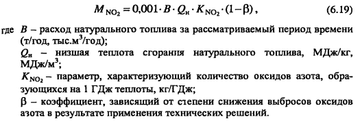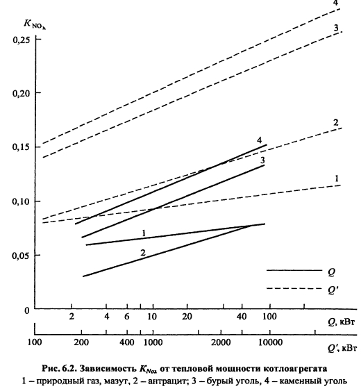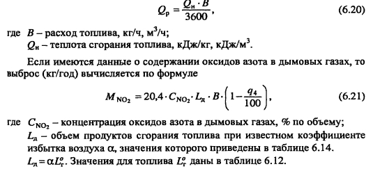 Расчет выбросов оксидов азотаКоличество оксидов азота, в пересчете на N02, выбрасываемых в единицу времени (т/год, г/с), рассчитывается по формуле ![]() Значения определяются по графикам рис. 6.2 для различных видов топлива в зависимости от номинальной нагрузки теплогенератора. При нагрузке котла, отличающейся от номинальной, KN02 следует умножить на соответственно номинальная и фактическая мощности топливосжигающей установки, кВт. Теплопроизводительность топливоиспользующего оборудования (кВт) определяется по формуле ![]() ![]() ПРИМЕР 6.10. Определить количество окислов азота, удаляемых с дымовыми газами в атмосферу в течение рабочей смены (8 часов), при сжигании в камерной топке сушильной установки природного газа в количестве В- 120 м3/ч с теплотворной способностью (2н = 35700 кДж/м3. Системы по очистке выбросов от окислов азота или их снижению отсутствуют. Решение. Определяем тепловую мощность топочного устройства 35700 120. ![]() Из графиков рис 6 2 находим параметр KNO, = 0,07 кг/гДж С учетом заданного расчетного времени вычисляем количество выбросов в атмосферу окислов азота ![]() |