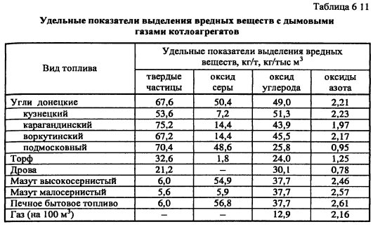 Расчеты выбросов в атмосферу вредных веществ при сжигании топливаПри сжигании твердого, жидкого и газообразного топлива выделяются зола (пыль), оксиды углерода, серы, азота, ванадия. Их количество в дымовых газах зависит от вида и состава топлива, конструкции топочных устройств и способа сжигания. Расчеты выделения вредных веществ при горении топлива производят по удельным показателям или балансовым методом. В первом случае массу выделившихся вредных веществ при сжигании всех видов топлива в котлоагрегатах любого типа находят из выражения ![]() Значения удельных выделений вредных веществ при сгорании топлива в котлоагрегатах приведены в таблице 6 11 ![]() ПРИМЕР 6.6. Рассчитать по удельным показателям выделение с дымовыми газами окислов азота за годовой период при сжигании в топке котлоагрегата подмосковного угля в количестве 1200 т/год Решение Из таблицы 6 11 находим удельный показатель выделения окислов азота при сжигании подмосковного угля qo2 = 0,95 кг/т Количество указанной вредности за расчетный период составит ![]() Более точные результаты дают расчеты вредных веществ в дымовых газах балансовым методом |
