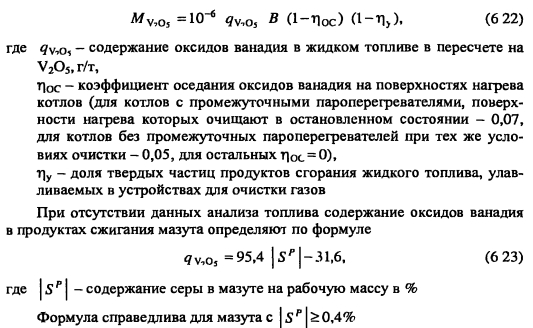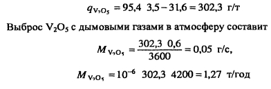 Расчет выбросов оксидов ванадияОксид ванадия относится к веществам 1 -го класса опасности, т е чрезвычайно опасным Количество выбрасываемых в атмосферу оксидов ванадия в пересчете на пятиоксид ванадия (т/год) находится по формуле ![]() ПРИМЕР 6.11. Определить количество выбросов V205 за 1 с и в год при сжигании в котлоагрегате мазута сернистостью 3,5% при расходе топлива 0,6 т/ч и 4200 т/год Устройства очистки газовых выбросов и условия для оседания оксидов ванадия отсутствуют Решение Находим содержание оксидов ванадия в топливе по его сернистости ![]() |