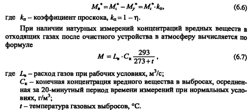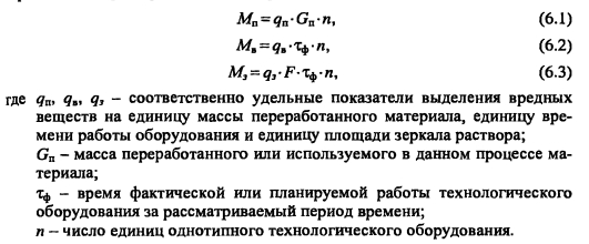 Расчеты выделений вредных веществ в воздушную среду технологическим оборудованием промышленных предприятиПри проектировании промышленных предприятий необходимо знать массовые выбросы вредных веществ в атмосферу. Их значения могут быть использованы при определении экологических характеристик технологических процессов и оборудования в их экспертной оценке, расчетов выбросов в ходе инвентаризации, для заполнения статической отчетности, разработке плановых мероприятий по сокращению выбросов вредных веществ. Состав вредностей, выделяющихся при производстве промышленной продукции, широк и разнообразен. Это связано с номенклатурой используемого технологического оборудования и исходными материалами в процессах производства, а также уровнем техники и культуры работы на конкретном предприятии. Для определения валовых выбросов вредных веществ с отходящими газами от технологического оборудования воздухом, отводимым местными отсосами и общеобменной вентиляцией, используются различные методы, а именно: на основе прямых инструментальных измерений концентраций, путем расчета материальных балансов процессов или удельных показателей. Последний метод широко используется в процессе проектирования новых производств. Исходными данными для установления удельных показателей служат экспериментальные и расчетные данные о количестве вредных веществ, выделяющихся в ходе технологического процесса или его отдельных операций, приведенных к единице массы получаемой продукции, расходуемого материала, единице времени работы агрегата, машины, станка или единицы площади зеркала раствора [11]. В таблицах значения удельных показателей выделений вредных веществ даны в некотором диапазоне величин, связанных с особенностями ведения технологического процесса применительно к конкретному производству. При проектных работах или недостаточных сведениях о ведении технологического процесса следует принимать их средние значения. При осуществлении модернизации оборудования принимают меньшие значения. При интенсификации технологических процессов: увеличении производительности оборудования, продувке воздухом, кислородом, подогреве шихты, ускоренной сушке и т.п. принимается максимальное значение удельных показателей. При предпроектной экологической оценке возможностей размещения производства на данной площадке расчеты следует вести по максимальным значениям удельных показателей выделения вредностей. Количество вредных веществ, содержащихся в отходящих газах, соответственно для удельных показателей на единицу массы переработанного материала, единицу времени работы оборудования и на единицу площади зеркала раствора определяют по формулам: ![]() Выделение вредных веществ происходит в момент работы технологического оборудования. Поэтому определение валового выброса связано для действующего оборудования с фактическим фондом времени работы оборудования, а для проектируемого - с планируемым эффективным фондом времени. Общее количество выделяемых технологическим оборудованием вредных веществ М по каждому из компонентов, присутствующих в выбросах предприятия (цеха, участка) находится суммированием величин во всех процессах: ![]() Количество вредных веществ, уловленных из общей массы образовавшихся в ходе производстве