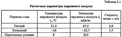 Расчетные параметры наружного и внутреннего воздухаРасчетные параметры наружного воздуха (температуру и энтальпию) при проектировании вентиляции общественных, административно-бытовых и производственных помещений следует принимать в соответствии с [1, 2] для теплого периода года по параметрам А, для холодного периода - по параметрам Б. Для переходных условий независимо от места расположения здания принимаем температуру наружного воздуха 8°С, энтальпию 22,5 кДж/кг [1, 2]. ПРИМЕР 2.1. Определить расчетные параметры наружного воздуха при проектировании систем вентиляции здания расположенного в г. Минске. В соответствии с приложением Е [2] принимаем параметры наружного воздуха для г Минска, которые представлены в табл. 2.1. ![]() Расчетные параметры внутреннего воздуха. Допустимые параметры (температура, относительная влажность, подвижность) воздуха в рабочей зоне помещений, отвечающие санитарно-гигиеническим требованиям, принимаются в зависимости от периода года и назначения помещений [1, 2, 7-9, 11-15 и др.]. ПРИМЕР 2.2. Определить параметры внутреннего воздуха для зала заседаний. Здание расположено в г. Минске. В соответствии с [1, 2, 7-9] нормируемая температура воздуха в зале заседаний для холодного периода и переходных условий 18°С; для теплого периода = t +3 - 21,2 + 3 = 24,2°С. ![]() |