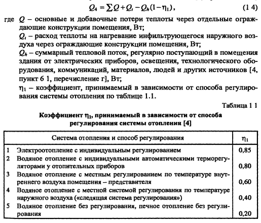 Расчетные потери теплоты отапливаемого здания. Расчет тепловой мощности системы отопленияРасчетные потери теплоты отапливаемого здания Q3d, Вт, определяются суммой потерь теплоты отапливаемых помещений ![]() Для расчета суммарных потерь теплоты каждого отапливаемого помещения предварительно необходимо: 1) выявить значения сопротивления теплопередачи для всех наружных ограждений, а также для внутренних, разделяющих помещения с разностью расчетных температур между ними 3°С и более; 2) вычертить планы этажей, подвала, чердака, разрезы здания в масштабе 1:100; 3) пронумеровать отапливаемые помещения. Как правило, нумерация производится, начиная с угловых комнат по ходу часовой стрелки (для первого этажа с №101, для второго - с №201 и т.д.). Лестничные клетки обозначаются буквами Помещения, не имеющие вертикальных наружных ограждений, можно не нумеровать, так как в таких помещениях не устанавливаются отопительные приборы. Теплопотери таких помещений (через полы или потолок) в этом случае следует добавить к теплопотерям помещений, отопительные приборы которых отапливают эти помещения Значения Q4 для каждого отапливаемого помещения определяются из теплового баланса отдельно рассчитываемых составляющих [4, Приложение М] ![]() Каждая из составляющих теплового баланса (14) отапливаемого помещения рассчитывается по соответствующей методике |