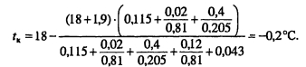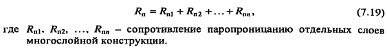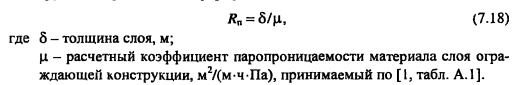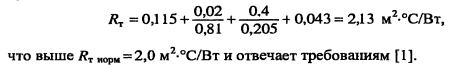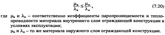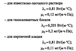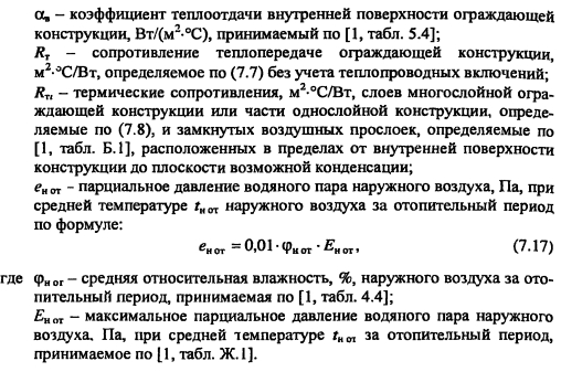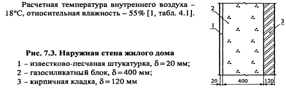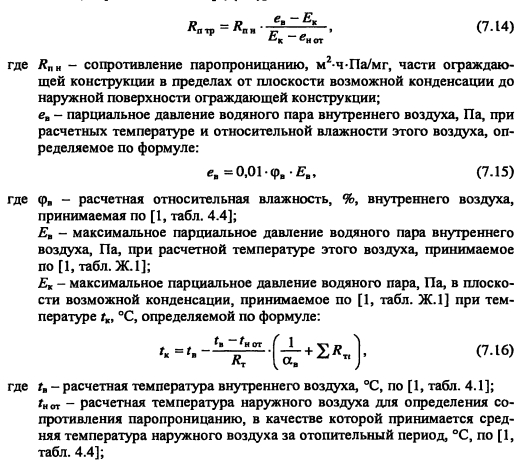 Сопротивление паропроницанию наружных ограждающих конструкцийДля обеспечения расчетных значений сопротивления теплопередаче при эксплуатации ограждающих конструкций последние должны находиться в соответствующих температурно-влажностных условиях, что определяется параметрами воздушной среды внутри и снаружи помещения и сопротивлением паропроницанию ограждающей конструкции. Сопротивление паропроницанию части ограждающей конструкции в пределах от внутренней поверхности до плоскости возможной конденсации должно быть не менее требуемого сопротивления паропроницанию, определяемого по [1, (9.1)]: ![]() ![]() Плоскость возможной конденсации - сечение ограждающей конструкции, перпендикулярное направлению теплового и влажностного потоков, в котором при расчетных значениях температуры и относительной влажности внутреннего и наружного воздуха имеет место наибольшее превышение расчетного парциального давления водяного пара над максимальным парциальным давлением, соответствующим температуре ограждения в данном сечении. Для расчета требуемого сопротивления паропроницанию ограждающей конструкции принимают, что плоскость возможной конденсации в однородной (однослойной) конструкции располагается на расстоянии равном 0,66 толщины конструкции от ее внутренней поверхности, а в многослойной конструкции совпадает с поверхностью теплоизоляционного слоя, ближайшей к наружной поверхности ограждающей конструкции. Сопротивление паропроницанию, слоя ограждающей конструкции определяют по формуле: ![]() Сопротивление паропроницанию части многослойной конструкции (от внутренней поверхности конструкции до плоскости возможной конденсации или от плоскости возможной конденсации до наружной поверхности конструкции) определяют как сумму сопротивлений паропроницанию составляющих данную часть конструкции слоев: ![]() Сопротивление паропроницанию воздушных прослоек в ограждающих конструкциях принимают равным нулю независимо о г толщины и расположения этих прослоек. Сопротивление паропроницанию некоторых листовых материалов и тонких слоев пароизоляции принимают по [1, табл. И.1]. Не требуется определять сопротивление паропроницанию следующих наружных ограждающих конструкций помещений с сухим или нормальным режимом: - однородных ( однослойных); - двухслойных при выполнении условия: ![]() Пример расчета 7.4. Требуется рассчитать сопротивление паропроницанию наружной стены жилого здания из мелкошгучных газосиликатных блоков, конструкция которой приведена на рис. 7.3, для климатических условий Могилевской области. ![]() Влажностный режим помещений - нормальный, условия эксплуатации ограждающих конструкций - «Б» [1, табл. 4.2]. Расчетные значения коэффициентов теплопроводности А и паропроницаемости р, материалов стены принимаем по [1, табл. А.1] для условий эксплуатации «Б»: ![]() Расчетные параметры наружного воздуха для расчета сопротивления паропроницанию - средние значения температуры и относительной влажности за отопительный период. Для Могилевской области средняя температура наружного воздуха за отопительный период 1,9°С [1, табл. 4.4], средняя относительная влажность наружного воздуха за отопительный период 84% [1, табл. 4.4]. Парциальное давление водяного пара внутреннего и наружного воздуха при расчетных значениях температуры и отно