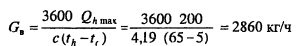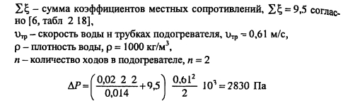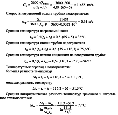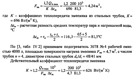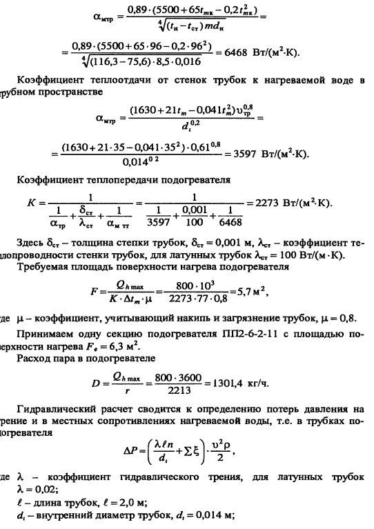 Тепловой и гидравлический расчет пароводяных подогревателейПРИМЕР 5.8. Подобрать пароводяной подогреватель для системы горячего водоснабжения. Выполнить его тепловой и гидравлический расчет при следующих исходных данных: тепловая нагрузка системы горячего водоснабжения 800 кВт, давление насыщенного пара 0,18 МПа, температура холодной воды tc = 5°С, горячей воды на выходе из подогревателя. Решение. Для пара 0,18 МПа находим температуру насыщения 116,3°С и скрытую теплоту парообразования 2213 кДж/кг. Исходя из тепловой нагрузки системы горячего водоснабжения, принимаем предварительно по [6, табл. 2.10] подогреватель ПП2-6-2-11 со следующими техническими характеристиками: наружный диаметр корпуса 325 мм, внутренний диаметр корпуса 309 мм, длина трубок I = 2000 мм, количество трубок 68 шт, диаметр трубок (внутренний и наружный) 14 мм, 16 мм, число ходов по воде 2, приведенное число трубок в вертикальном ряду 8,5, площадь поверхности нагрева 6,3 м2 площадь живого сечения трубного пространства 0,0052 м2, площадь живого сечения межтрубного пространства= 0,061 м2. ![]() Коэффициент теплоотдачи от пара к стенкам трубок в межтрубном пространстве ![]() ![]() ![]() ПРИМЕР 5.9. Требуется подобрать емкое гной пароводяной подогреватель для нагрева воды с температурой tc = 5°С до температуры th = 65°С насыщенным паром Р - 180 кПа Тепловая нагрузка системы горячего водоснабжения Qhma = 200 кВт Решение Из [3, табл III5] находим температуру насыщения пара tn = 116,3°С и скрытую теплоту парообразования г = 2218 кДж/кг Требуемая поверхность нагрева змеевика ![]() В режиме непрерывной работы подогревателя расход нагреваемой воды ![]() Расход пара ![]() |