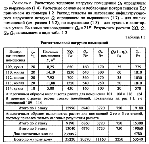 Тепловой баланс помещений и зданияТепловой баланс здания Q3d рассчитывается по выражениям (1 3) и (1 4) Для определения расчетных суммарных потерь теплоты отапливаемых помещений Q4 необходимо предварительно выбрать тип системы отопления, а также уровень и способ регулирования системы отопления, что позволит задаться значением коэффициента т]ь входящего в выражение (1 4) Тепловая расчетная нагрузка помещения соответствует величине расчетных суммарных потерь теплоты помещения <24 ПРИМЕР 1.3. Определить тепловые расчетные нагрузки помещений трехэтажного жилого дома, представленного в примере 1 1 на рис 1 1 Расчетная температура наружного воздуха для холодного периода года text = = -25°С Исходными данными приняты результаты расчета примера 1 2 К проектированию задана система водяного отопления с индивидуальными автоматическими терморегуляторами у отопительных приборов, из табл 1 1 - тц =0,80 ![]() |