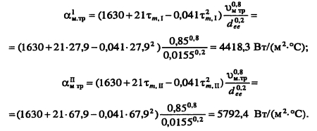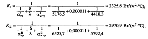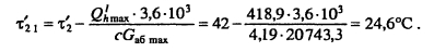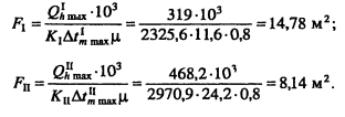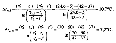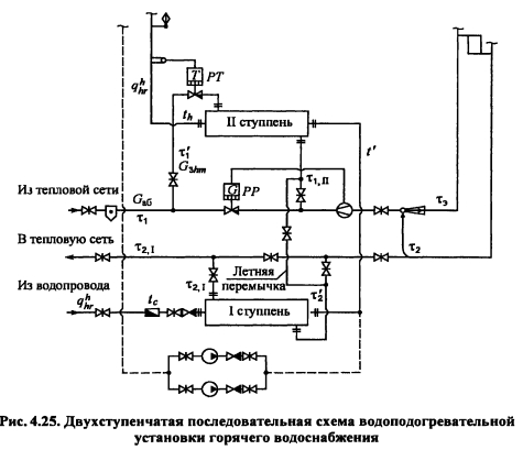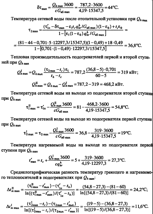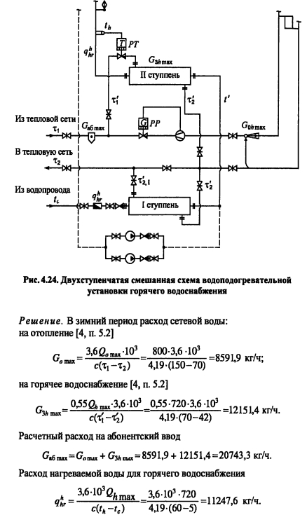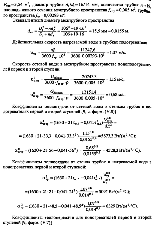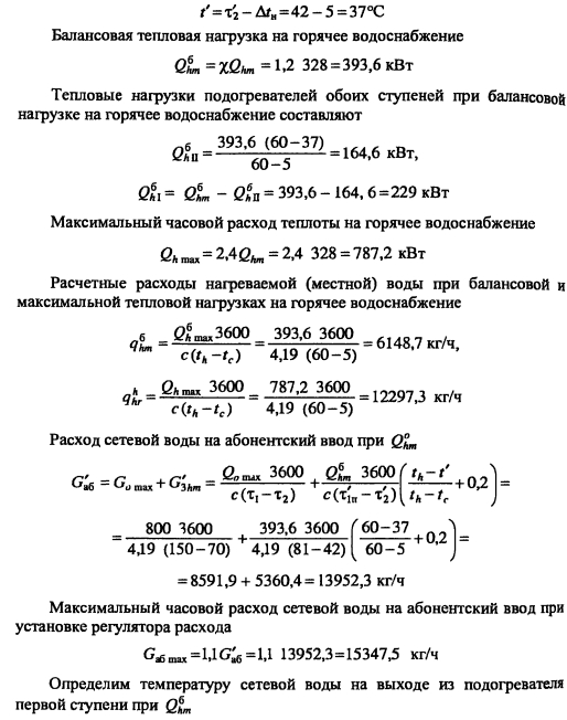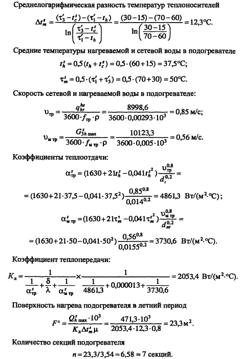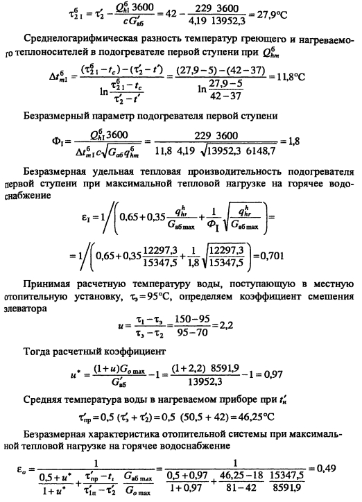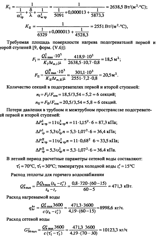 Тепловой и гидравлический расчет водоподогревательных установокТепловой и гидравлический расчет водоподогревателей сводится к определению расчетной поверхности нагрева, выбора номера и количества секций, а также гидравлического сопротивления водоподогревателя по бреющей и нагреваемой воде. Расчет водоподогревателей системы горячего водоснабжения при любых схемах подключения их к тепловым сетям производится для самого неблагоприятного режима, соответствующего точке излома температурного графика или по минимальной температуре воды, если отсутствует излом графика [4, п. 11.9] Для скоростных секционных водоподогревателей следует принимать противоточную схему потоков теплоносителей, при этом греющая вода из тепловой сети должна поступать в межтрубное пространство Кроме скоростных водоподогревателей, могут использоваться пластинчатые. Число водоводяных подогревателей для системы горячего водоснабжения принимается равным двум параллельно включенным в каждой ступени подогрева, рассчитанных на 50% теплового потока [4, п. 11.12]. При максимальном тепловом потеке до 2 МВт предусматривается установка по одному водоподогревателю в каждой ступени нагрева Водоподогреватели горячего водоснабжения присоединяются к тепловым сетям в ЦТП по параллельной или двухступенчатой схемам. Расчет двухступенчатой последовательной схемы ведется по балансовой нагрузке горячего водоснабжения, а расчет двухступенчатой смешанной схемы производят при условии равенства температур сетевой воды после подогревателя второй ступени и после системы отопления. При наличии в системе горячего водоснабжения баков-аккумуляторов расчет производится по среднечасовой тепловой нагрузке, а при их отсутствии - по максимальной. Тепловой расчет водоподогревателей сводится к определению коэффициентов теплопередачи, площади поверхности нагрева и потерь давления в них греющей и нагреваемой воды. При этом скорость движения нагреваемой воды в трубках должна быть в пределах 1-2,5 м/с, в межтрубном пространстве - не более 2 м/с. Методика теплового и гидравлического расчетов водоподогревательных установок приведена в [9, с. 136-148]. ПРИМЕР 4.28. Произвести тепловой и гидравлический расчеты водоподогревательной установки системы горячего водоснабжения, присоединенной по двухступенчатой смешанной схеме (рис 4.24) Тепловая нагрузка на отопление 800 кВт, а горячее водоснабжение 720 кВт Температура сетевой воды, соответствующая точке излома графика, 70°C, 42°С Температура холодной и горячей воды 5°С, 60°С Расчетная температура сетевой воды 150°С,70°С. ![]() Температура нагреваемой воды на выходе из подогревателя первой ступени [9, форм. (V.16)]. Теплопроизводительность подогревателей второй и первой ступеней: ![]() Температура сетевой воды на выходе из подогревателя первой ступени ![]() Среднелогарифмические разности температур между греющим и нагревательным теплоносителями в подогревателях первой и второй ступеней: ![]() Средние температуры сетевой и нагреваемой воды в подогревателях первой и второй ступеней: ![]() Задавшись скоростью нагреваемой воды 1) = 1 м/с, определяем требуемую площадь живого сечения трубного пространства подогревателя ![]() К установке принимаем скоростной водоподогреватель типа 08 ОСТ 34-588-68 с техническими данными: длина секции 4000 мм, внутренний диаметр корпуса