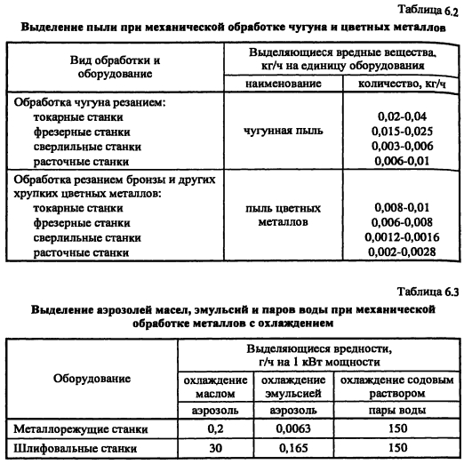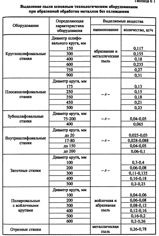 Участки механической обработки материаловХарактерной особенностью процессов механической обработки материалов на различных станках (токарных, фрезерных, шлифовальных, наждачных и др.) является наличие в аспирируемом от оборудования загрязненном воздухе преимущественно твердых частиц. Для таких производств массу пыли устанавливают как выделенную в единицу времени на единицу оборудования. При этом валовые выделения вредных веществ рассчитываются из нормо-часов работы станочного парка, а их поступления в атмосферу - с учетом эффективности пылеулавливающего оборудования. Удельные показатели выделения вредных веществ в единицу времени на единицу основного технологического оборудования механической обработки материалов приведены в таблицах 6.1,6.2,6.3. ![]() ![]() ПРИМЕР 6.1. Для целей экологической оценки определить увеличение количества выбросов в атмосферу пыли от дополнительной установки в цехе 4-х заточных станков с диаметром круга 400 мм и 3-х отрезных при их объединении в аспирационную систему, оснащенную пылеуловителем с эффективностью очистки 82-90%. Годовой фонд времени работы оборудования - 3980 часов, коэффициент загрузки оборудования - 0,8. Решение. Из таблицы 6.1 значение удельного показателя выделения пыли для указанного заточного станка составит 0,18 кг/ч, а отрезного - 0,78 кг/ч. Выбор удельных показателей по максимальным значениям, а степень очистки 82% по минимальному осуществлен исходя из заданного условия использования данных для экологической оценки. Количество выбросов абразивной и металлической пыли составит Мв = (0,18 4 + 0,78 3) (1 - 0,82) 3980 0,8 10"3 = 1,754 т/год. ![]() |