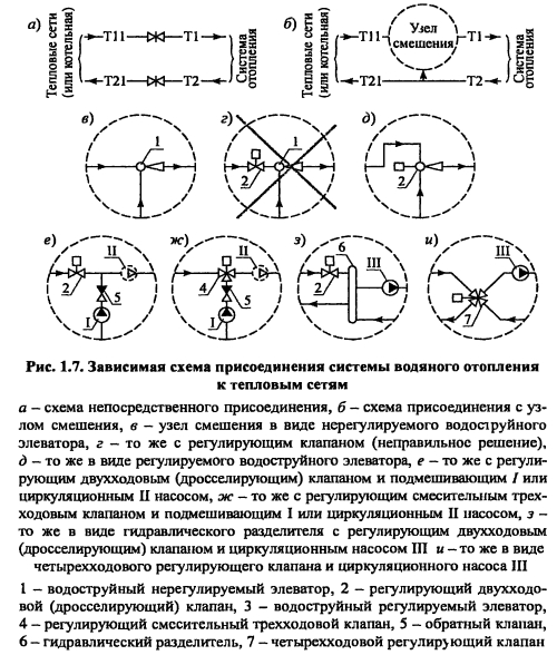 Выбор схемы присоединения системы водяного отопления к тепловым сетямВ тепловом пункте здания присоединение системы водяного отопления к централизованным тепловым сетям может осуществляться по зависимой или независимой схемам. При зависимой схеме присоединения теплоноситель централизованных тепловых сетей используется непосредственно в системе отопления. При независимой схеме присоединения применяется теплообменник, разделяющий теплоносители системы отопления и тепловых сетей. Приоритетной является зависимая схема, как наиболее дешевая и простая в монтаже и эксплуатации. Независимая схема присоединения используется при недостаточном или высоком для эксплуатируемой системы отопления гидростатическом давлении на вводе тепловой сети в тепловой пункт здания. Зависимая схема присоединения может быть непосредственной (рис. 1.7 а) или с применением узла смешения (рис. 1.76). Оптимальным является вариант схемы присоединения, показанный на рис. 1.7 а, при которой обеспечивается непосредственная обратная связь между пользователем тепловой энергии и теплопроизводителем при регулировании производства теплоты. Однако такое прямое присоединение возможно только при использовании низкотемпературных тепловых сетей с постоянными в течение года параметрами теплоносителя, например 80- 60°С, и только для двухтрубных систем отопления с радиаторными дросселирующими термостатами. Тепловые сети в данном случае реагируют на изменение спроса потребителя в теплоте через датчики перепада давления на вводах, с помощью которых электронными регуляторами изменяется подача сетевых насосов тепловых сетей (количественное регулирование). Схема, приведенная на рис. 1.76 применяется для подсоединения к тепловым сетям, расчетные температурные параметры которых выше параметров системы отопления. Водоструйный элеватор на рис. 1.1 в сочетает в себе функции смесителя и циркуляционного насоса, но с низким КПД. Данная схема широко применяется для нерегулируемых систем отопления, так как является простой и надежной в эксплуатации, не нуждается в электроэнергии. В практике автоматизации и переоборудования тепловых узлов имело место использование схемы рис 11 г с установкой клапана 2 перед элеватором 1 Такой подход является неверным, так как при дросселировании потока клапаном 2 резко падают насосные качества элеватора Поэтому разработчики обычно дополнительно устанавливают в эту схему насос и обратный клапан, для которых элеватор становится только помехой При его устранении имеет место схема рис 1 1е При наличии достаточного для работы элеватора перепада давления на вводе хорошие характеристики имеет узел смешения в виде регулируемого водоструйного элеватора (рис 11д), в котором с помощью сервомотора изменяется сечение сопла элеватора ![]() Схемы смешения, показанные на рис 1 le, 1 7ж наиболее распространены при присоединении к централизованным тепловым сетям Схема с использованием трехходового клапана 4 (рис 11 ж) отличается значительно более широким диапазоном коэффициента смешения по сравнению со схемой на рис 1 Те Подмешивающий насос / используется при наличии достаточного для работы системы отопления перепада давления на вводе тепловых сетей В противном случае устанавливается циркуляционный насос II Смесительные узлы с использованием ги