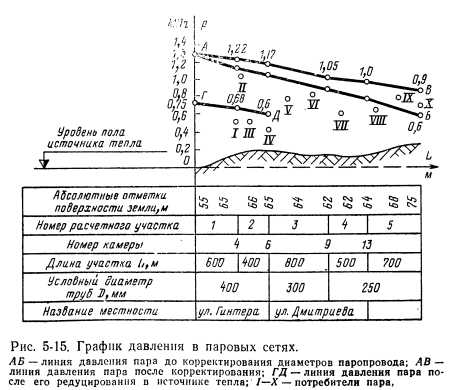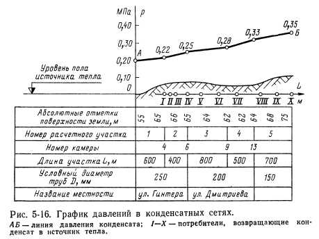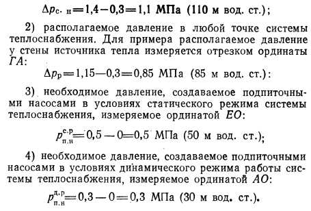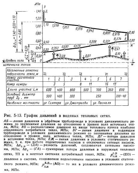 ГРАФИКИ ДАВЛЕНИЙДвижение теплоносителя в трубопроводах осуществляется за счет разности давлений в разных точках системы. Система теплоснабжения может находиться в динамическом или в статическом режимах. Динамический режим характеризуется движением теплоносителя за счет разности давлений его по пути. При статическом режиме система находится в состоянии готовности к работе и под давлением, но без движения теплоносителя в системе. График давлений, называемый также пьезометрическим графиком, показывает располагаемое давление (разность давлений в подающем и обратном трубопроводах) теплоносителя в любой точке системы теплоснабжения, что необходимо для решения ряда важнейших вопросов при проектировании, строительстве, наладке и эксплуатации всех элементов системы. К таким вопросам относятся: 1) проверка правильности выбора диаметров тепловых сетей, определенных ранее сделанным гидравлическим расчетом трубопроводов; 2) выявление необходимости сооружения насосных станций для повышения давления в системах водяных тепловых сетей и конденсатопроводов; 3) определение давлений при разных режимах работы и этапах развития системы централизованного тепло- Снабжений при теплоносителе воде, что необходимо для выбора сетевых и подпиточных насосов; 4) определение давлений в системе конденсатопроводов, что необходимо для выбора насосов перекачки конденсата, размещаемых в тепловых пунктах потребителей тепла; 5) выявление располагаемого давления в водяных тепловых сетях на вводе у каждого потребителя тепла при различных режимах работы системы теплоснабжения; 6) выявление минимальных и максимальных давлений в подающем и обратном трубопроводах водяных тепловых сетей на вводе у каждого потребителя для выбора схемы теплоснабжения (зависимой или независимой), а также во избежание вскипания воды и образования пара в системе; 7) определение мест образования вакуума, в которых возможен подсос воздуха из атмосферы, препятствующий нормальной работе системы, при некоторых режимах работы системы водяных тепловых сетей и конденсатопровод ов. Каждому теплоносителю и каждой системе теплоснабжения соответствует свой особый график давлений, поэтому для водяных тепловых, паровых и конденсатных сетей строятся отдельные, свойственные им графики. Для построения графика давлений должна быть предварительно разработана тепловая карта города, составлен план магистральных тепловых сетей и проведены соответствующие гидравлические расчеты сетей. График давлений водяных тепловых сетей. Графики давлений водяных тепловых сетей обычно строятся для: 1) зимнего режима ближайшего отопительного периода; 2) летнего режима ближайшего летнего периода; 3) зимнего режима последнего года ближайшего пятилетия; 4) летнего режима последнего года ближайшего пятилетия; 6)зимнего режима последнего года ближайших 15— 20 лет. Графики давлений в зимнем и летнем режимах ближайшего года по освоению проектной мощности системы необходимы для правильной наладки и эксплуатации всей системы теплоснабжения. Графики давлений зимнего и летнего режимов последнего года пятилетия Нужны для выбора зимних и летних сетевых и подпиточных насосов источника тепла. График давлений зимнего режима последнего года ближайших, 15—20 лет требуется для проверки диаметров тепловых се