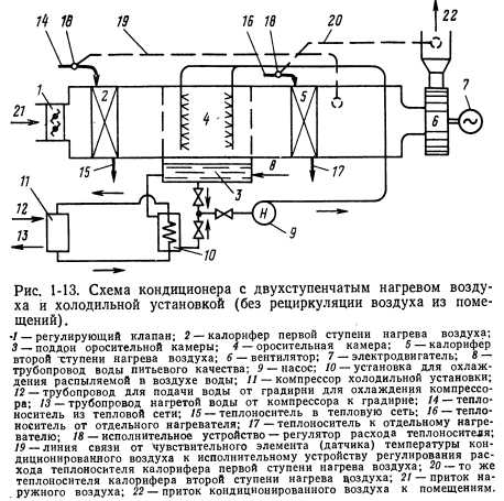 КОНДИЦИОНИРОВАНИЕ ВОЗДУХАКондиционирование воздуха служит для создания в помещениях искусственного улучшенного климата, т. е. обеспечивает заданные температуру, влажность и чистоту воздуха при соблюдении допустимой скорости движения воздуха в помещении. При современном уровне развития техники производственные процессы во многих отраслях промышленности немыслимы без поддержания в цехах строго определенных параметров воздушной среды (например, при изготовлении полупроводников, в точном приборостроении, текстильной промышленности, складских хозяйствах бумаги, табака и пр.). Актуальной проблемой является также устройство систем кондиционирования воздуха на крупных торговых предприятиях, в залах заседаний, кинотеатрах и в других помещениях, где скапливается большое количество людей. В большинстве таких зданий кондиционирование воздуха весьма целесообразно и постепенно внедряется в жизнь. Желательно также устройство кондиционирования воздуха для жилых помещений в южных районах страны. Применение кондиционирования воздуха в прядильных, ткацких и отделочных цехах текстильной, а также на многих призводствах химической, биологической, пищевой и других отраслей промышленности дает возможность: 1) увеличить объем выпускаемой продукции путем ускорения протекания технологических процессов; 2) обеспечить выпуск продукции более высокого качества: например, в текстильной промышленности кондиционирование воздуха положительно влияет на равномерность сечения, эластичность и прочность нити, уменьшается обрывность пряжи и количество узелков в ткани; 3) создать более здоровые условия для пребывания людей в производственных, общественных и жилых помещениях, увеличивая бодрость и работоспособность человека. Процесс кондиционирования воздуха должен быть полностью автоматизированным. Неавтоматизированные системы работают неточно и неэкономично и поэтому почти не применяются. Автоматизированные системы практически могут поддерживать в помещениях устойчивую температуру (Д/=±ГС) и относительную влажность воздуха ф в пределах ±7%. Увеличивая чувствительность средств автоматизации и точность работы системы, можно еще более уменьшить пределы колебаний заданных параметров воздуха. Системы кондиционирования воздуха классифицируются по следующим признакам: 1. По области применения: а) технологические системы (в промышленности); б) комфортные системы (в производственных, общественных и жилых зданиях). 2. По рабочим сезонам: а) системы, работающие круглогодично. Применяются в промышленности и для объектов специального назначения; б) системы, работающие только в теплые месяцы года. В этих системах воздух в зависимости от погодных условий может охлаждаться, увлажняться и осушаться. Такие системы применяются в общественных, жилых зданиях, а нередко и в производственных. 3. По производительности системы и по району обслуживания: а) местные системы с кондиционерами мощностью от 1,5 до 10 тыс. м3 воздуха в час. Кондиционер местной системы обслуживает только одно помещение и обычно находится там же или в рядом расположенном помещении; б) центральные системы с кондиционерами мощностью от 10 до 250 тыс. м3 воздуха в час, предназначенные для обслуживания большого числа помещений. 4. По количеству ступеней нагрева воздуха: а) одноступенча
