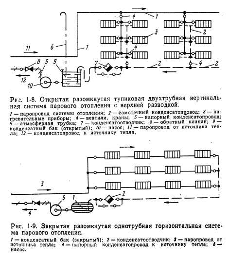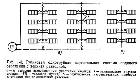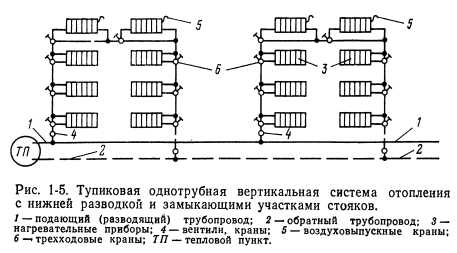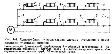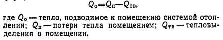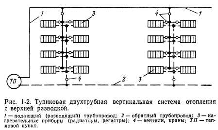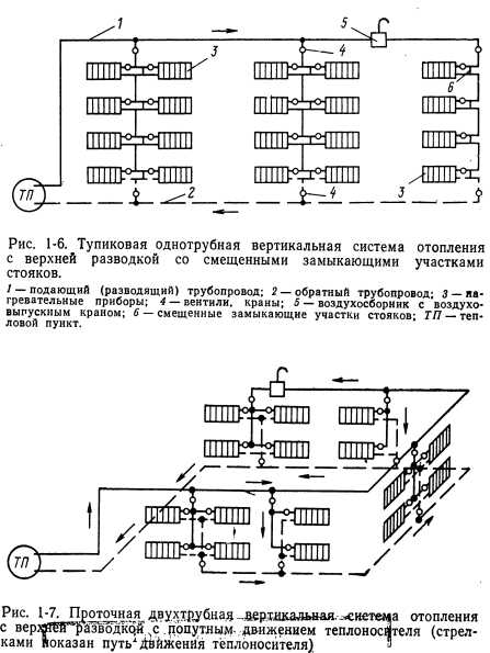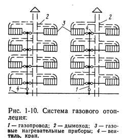 ОТОПЛЕНИЕНазначение системы отопления состоит в поддержании в помещениях определенной положительной температуры. Следовательно, система отопления должна компенсировать потери тепла помещениями. При этом следует учитывать возможные выделения тепла в помещениях. Описанный процесс выражается следующей формулой: ![]() Тепло в помещениях может выделяться работающим оборудованием, электродвигателями, машинами, протекающими химическими процессами, поддержанием открытого огня, присутствующими людьми, различными генераторами тепла и т. п. В случаях, если величина QTB переменная и неопределенная (например, появляющаяся несколько часов в сутки, несколько дней в неделю), ею пренебрегают и принимают Q тв—0, т. е. Qo—Q п. Отопительные установки подразделяются на местные и центральные. В местных установках источник тепла выполняется в виде печей, газовых калориферов (когда сжигание газа происходит непосредственно в нагревательном приборе) или электрокалориферов. Пространство, в котором действует местная отопительная установка, ограничивается обычно одним помещением. Печи иногда обогревают два смежных помещения. В системах центрального отопления источником тепла служат водогрейные или паровые котлы, расположенные вне отапливаемых помещений. Из котлов теплоноситель поступает к нагревательным приборам помещений по системе трубопроводов. В зависимости от вида теплоносителя системы центрального отопления подразделяются на водяные, паровые, воздушные и комбинированные (пароводяные, паровоздушные и др.). Водяные системы отопления подразделяются в зависимости от температуры теплоносителя на системы отопления горячей водой низких параметров (с температурой воды Ю0°С) и системы отопления горячей водой повышенных параметров (с температурой воды 100°С). Системы парового отопления в зависимости от начального давления пара подразделяются на системы низкого давления с параметрами пара р=0,105-- 0,17 МПа (примерно 1,05—1,7 кгс/см2) и системы высокого давления с параметрами пара р>0,17 МПа (1,7 кгс/см2). Обычно система отопления выбирается в зависимости от назначения здания, а в промышленности — от технологии производства с учетом действующих санитарных и противопожарных норм. При выборе системы отопления необходимо также учитывать экономические соображения. Водяное отопление. В настоящее время наиболее распространенной системой отопления является система водяного отопления, отлично себя зарекомендовавшая для большинства типов зданий. При выборе систем водяного отопления следует учитывать возможность последующего включения рассматриваемого здания в систему централизованного теплоснабжения. В соответствии с этим ниже приводятся характеристики наиболее распространенных систем центрального водяного отопления зданий различной этажности. Конструктивно эти системы подразделяются следующим образом: ![]() 1. Классификация систем водяного отопления по схеме расположения труб стояков: а) двухтрубная вертикальная система (рис. 1-2). В прошлом в многоэтажных зданиях применялась только двухтрубная система водяного отопления. Она хорошо регулируется, допускает по сравнению с другими системами несколько меньшие поверхности нагревательных приборов, но расход труб в этой системе в 1,3—1,7 раз превышает расход труб при однотрубной системе. В последн