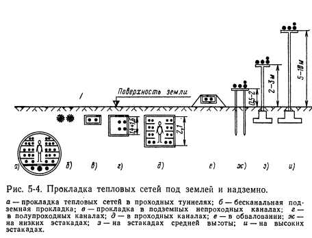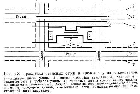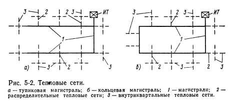 ПРОКЛАДКА ТЕПЛОВЫХ СЕТЕЙПосле составления тепловой карты города, размещения на ней районного источника тепла и определения границ централизованного теплоснабжения города можно приступить к нанесению на план города трасс магистральных тепловых сетей. Тепловые сети, соединяющие районный источник тепла с ТП потребителей, подразделяются следующим образом: 1)магистральные тепловые сети, представляющие собой главные теплопроводы, расположенные на участке от районного источника тепла до каждого микрорайона и крупного предприятия, и от которых ответвляются все остальные тепловые сети; ![]() 2) распределительные или межквартальные тепловые сети, ответвляющиеся от магистральных тепловых сетей, распределяют и транспортируют теплоноситель ко всем кварталам города и.предприятиям средней величины. Теплопроводы распределительных тепловых сетей, как правило, обладают меньшим диаметром и длиной, чем магистральные, но в отдельных случаях в начальных участках могут иметь больший диаметр, чем теплопровод конечного участка магистральной сети; 3) внутриквартальные тепловые сети, ответвляющиеся от распределительных или непосредственно от магистральных тепловых сетей и заканчивающиеся в ТП потребителей тепла, куда они доставляют приготовленный в источнике тепла теплоноситель. Трассирование тепловых сетей на плане и профиле города начинают с магистральных сетей, от которых зависит правильное построение распределительных и внутриквартальных сетей. Магистральные тепловые сети разделяются по конфигурации и особенностям расчета и эксплуатации на тупиковые или радиальные (рис. 5-2,а) и кольцевые (рис: 5-2,6). Протяженность тупиковых магистралей короче, стоимость меньше и расчет их проще. Кольцевые магистрали обеспечивают большую надежность и дают возможность поддерживать в системе тепловых сетей более устойчивые .гидравлические режимы. Неодинаковые потери давления, возникающие в ветвях кольцевой магистрали при разной нагрузке систем теплоснабжения, систематических или аварийных отключениях крупных потребителей тепла легче выравниваются. Кроме того, при кольцевой прокладке магистрали ремонт или авария отдельного участка сети, как правило, в меньшей степени нарушают эксплуатацию системы теплоснабжения в целом. Для правильного выбора трассы тепловых сетей на плане города следует учитывать ряд технико-экономических соображений: 1. Магистральные сети должны проходить вблизи центра тепловых нагрузок города. 2. Трасса магистральных теплопроводов должна быть по возможности короче. 3. Тепловые сети вообще и магистральные в особенности не должны прокладываться под землей в затопляемых районах города и по возможности не укладываться ниже уровня стояния грунтовых вод. 4. Магистральные теплопроводы должны прокладываться с таким расчетом, чтобы сооружение их не создавало трудностей существующей и перспективной застройке, а также системе транспорта города. 5. Тепловые сети должны быть по возможности дешевыми в строительстве и надежными в эксплуатации. 6. Трассы магистральной тепловой сети должны выбираться с таким расчетом, чтобы возможно лучше обеспечивать их надежную работу в особых аварийных режимах (при землетрясении, стихийных бедствиях и т.д.). 7. Прокладка и архитектурное оформление отдельных элементов тепловой сети должны 