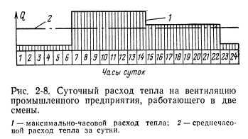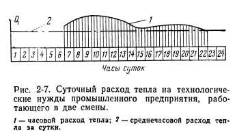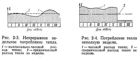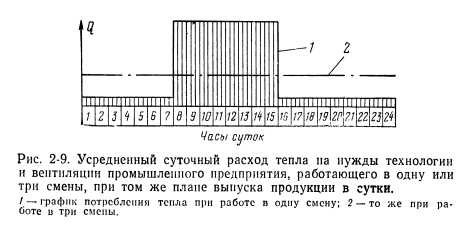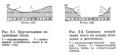 РЕЖИМЫ РАСХОДОВАНИЯ ТЕПЛАРежимы расходования тепла на отопление, вентиляцию, кондиционирование воздуха, горячее водоснабжение и технологические нужды весьма различны. В практике централизованного теплоснабжения разнообразие режимов теплопотребления является причиной значительных трудностей. Рабочий режим источника тепла должен быть таким, чтобы при любом режиме расходования тепла потребителем была возможность наиболее полно и качественно обеспечить теплом всех потребителей района. Это важная и необходимая, хотя и не всегда легко выполнимая задача. Для правильного выбора и расчета источника тепла и определения рабочего режима всей системы централизованного теплоснабжения необходимо определить и оценить конкретные условия теплопотребления данной системой во всех его аспектах. ![]() Существуют потребители, расходующие тепло круглый год. Обычно тепло расходуется неравномерно, причем характер неравномерности зависит от особенностей рассматриваемого года, месяца, недели, суток, рабочей смены, температуры наружного воздуха и многого другого. К круглогодовым потребителям тепла относятся технологические процессы и горячее водоснабжение (рис. 2-1). Некоторые потребители расходуют тепло только в определенный сезон, например в отопительный период в системе отопительного теплоснабжения. Сезонность теплопотребления наблюдается также в промышленности при производстве сахара, переработке осенью и зимой сахарной свеклы, консервировании летом и осенью овощей и фруктов, переработке и консервировании рыбы в районах сезонного лова и т. д. На рис. 2-2 изображено потребление тепла на отопление по месяцам года. Расход тепла в системах отопления вентиляции и коцдиционирования воздуха зависит от температуры наружного воздуха, которая в одинаковые месяцы разных лет может быть весьма различной. Наблюдаются разные режимы расходования тепла в течение недели. Некоторые потребители расходуют тепло в течение всех дней недели (например, системы отопления и горячего водоснабжения жилых домов). Расход тепла в течение недели может быть равномерным или неравномерным. Равномерный расход тепла предприятием на технологические процессы имеет место только в том случае, если производство работает непрерывно и равномерно все семь дней недели при относительно постоянной температуре наружного воздуха (рис. 2-3). Расход тепла в системах отопления, вентиляции и кондиционирования воздуха, как правило, неравномерен и зависит от наружной температуры. Неравномерность расхода тепла на горячее водоснабжение вызывается разнообразием потребностей и привычек потребителей горячей воды. Неравномерность расхода тепла на технологию связана со многими причинами — цикличностью производства, неритмичностью работы, количеством рабочих смен в- сутки, разной нагрузкой смен и т. д. ![]() Есть потребители, расходующие тепло только в рабочие дни недели (рис. 2-4). Такой режим потребления тепла характерен для технологических процессов, вентиляции, кондиционирования воздуха и горячего водоснабжения промышленных предприятий, работающих пять дней в неделю. В течение двух нерабочих дней расход тепла предприятием невелик и рассчитан только на поддержание соответствующих систем потребителей тепла в рабочем состоянии. На практике в таких случаях в зимние нерабочи