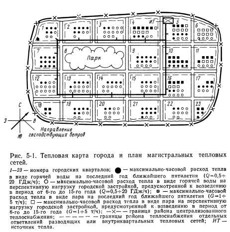 ТЕПЛОВАЯ КАРТАДля разработки тепловой карты города или его района необходимо подготовить следующие исходные материалы: 1) план города или его района в масштабе от 1:2000 до 1:25000 в зависимости от величины города; 2) сводную таблицу максимально-часовых расходов тепла потребителями района на уровне последнего года ближайшего пятилетия и ближайших 15—20 лет с указанием среднечасовых расходов тепла на бытовое горячее водоснабжение за отопительный период и среднечасовых расходов тепла на технологическое горячее водоснабжение промышленных и коммунальных предприятий за смену с наибольшей тепловой нагрузкой. Изготовление тепловой карты: 1. Нанести на план города нумерацию кварталов. Если таковой нет, необходимо провести нумерацию, согласовав ее со службой архитектора города. 2. На всех кварталах плана города условными обозначениями указать расход тепла в соответствии с данными сводной таблицы максимально-часовых расходов, тепла потребителями района. Обозначения расходов тепла на плане города служат для различия: расходов тепла при горячей воде в качестве теплоносителя, изображаемой кружками, от расходов пара, изображаемых квадратами; расходов тепла на уровне последнего года ближайшего пятилетия, изображаемых кружком и квадратом, от расходов тепла на перспективную нагрузку городской застройки, предусмотренной к воздействию в течение от 6-го до 15-го годов, изображаемых незакрашенными кружками и квадратами. Изготовленная таким образом тепловая карта (рис. 5-1) дает наглядное представление о застройке города и его расхода тепла на ближайшие годы и более отдаленную перспективу. ![]() Указанные на тепловой карте расходы тепла на последний год ближайшего пятилетия определяют проектируемую тепловую нагрузку источника тепла в виде горячей воды и пара. При этом пятилетие определяет проектный срок сооружаемого источника тепла. После исчерпания тепловой мощности источника тепла нагрузками существующих потребителей тепла и объектов строительства ближайшего пятилетия потребуется расширить источник тепла для обеспечения тепловых потребителей следующего пятилетия. Для расчета диаметра трубопроводов проектируемых тепловых сетей пользуются как исходным материалом расходами тепла, указанными на тепловой карте на последний год ближайшего .пятнадцатилетия. Шираке 3. Э. Теплоснабжение: пер. с латыш. — М.: Энергия, 1979. |