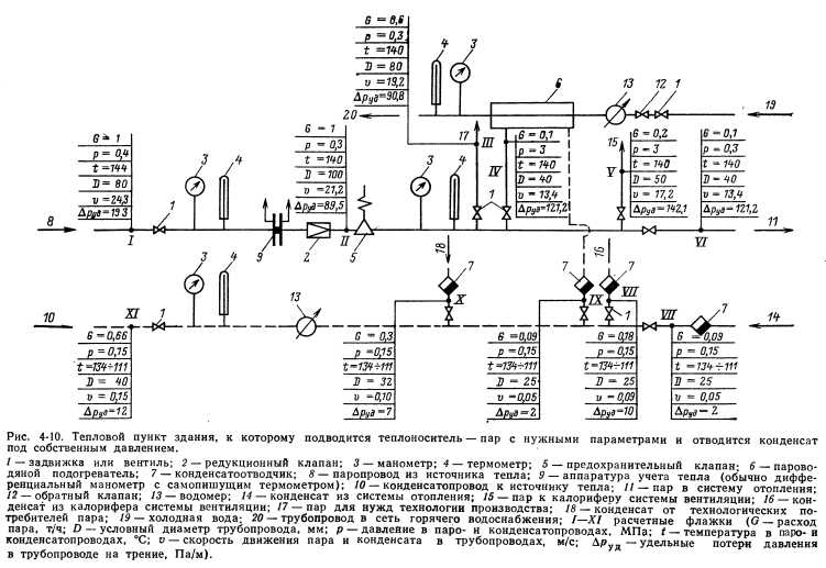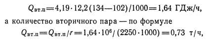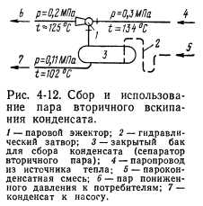ТЕПЛОВЫЕ ПУНКТЫ С ПАРОМ В КАЧЕСТВЕ ТЕПЛОНОСИТЕЛЯТепловой пункт, в который поступает сухой насыщенный пар с давлением р=0,4 МПа и температурой 144°С показан на рис. 4-10. Местным системам для технологических процессов производства, отопления, вентиляции и горячего водоснабжения требуется сухой насыщенный пар давлением р=0,3 МПа. Для получения пара с заданным давлением в ТП установлен редукционный клапан. При таком редуцировании давления согласно s-диаграмме незначительно снижается температура (от 144 до 140°С) при постоянном значении его энтальпии. С уменьшением давления пар перегревается. Перегрев пара давлением р=0,3 МПа составит At= =140—134=6°С. Этот небольшой перегрев пара используется для предупреждения возможности образования конденсата в паропроводе на участке от ТП до нагревательных приборов. ![]() Для защиты местных систем от непроизвольного и зачастую опасного увеличения давления в ТП за редукционным клапаном установлен предохранительный клапан. Редуцированный пар разводится затем по местным системам потребителей и поступает в соответствующие нагревательные приборы. В них пар отдает свое тепло, начиная конденсироваться при давлении 0,3 МПа и температуре насыщения пара 133,54°С. Образовавшийся конденсат самотеком стекает к конденсатоотводчикам, практически сохраняя свои давление и температуру. Конденсатоотводчики, выпуская конденсат и препятствуя истечению пара, вызывают потери давления. Сразу за конденсатоотводчиком конденсат должен был бы иметь пониженное давление (р=0,15 МПа) при прежней температуре пара 134°С. Таким образом, при понижении давления в конденсатоотводчике с 0,3 до 0,15 МПа конденсат становится как бы перегретым. Однако согласно законам термодинамики горячая вода (конденсат) не может при давлении р=0,15 МПа-сохранить температуру 134°С, она должна понизиться до 111°С, т. е. до температуры насыщения при данном давлении. Так как энтальпия конденсата не может измениться, то такое понижение температуры сопровождается испарением из конденсата соответствующего количества воды с образованием так называемого пара вторичного вскипания. Учет количества потребляемого пара обычно производится самопишущими дифференциальными манометрами; учет возвращаемого конденсата и потребляемой горячей воды — водомерами. Для приготовления горячей воды в ТП установлен пароводяной подогреватель с автоматизируемым управлением. На рис. 4-11 схематически изображен ТП, обеспечиваемый из источника тепла перегретым паром, р= =1 МПа, П=300°С, причем для всех местных систем требуется сухой насыщенный пар с параметрами р= =0,3 МПа, /=134°С. Для приготовления пара нужных параметров в ТП установлена редукционно-охладительная установка (РОУ), понижающая давление и температуру пара до нужных значений. Снижение параметров пара в РОУ происходит следующим образом: вначале в редукционном устройстве РОУ снижается давление пара. Затем Для охлаждения пара до нужной температуры в охладительное устройство РОУ специальным насосом впрыскивается охлажденный до 60°С конденсат. Впрыснутый конденсат с энтальпией iK, испаряясь с поглощением тепла, охлаждает перегретый пар, одновременно увеличивая общее количество пара. В ТП в специальном баке, защищенном от переполнения автоматически действующим поплавковым краном, создается запас конденсата для впрыска. Количе