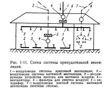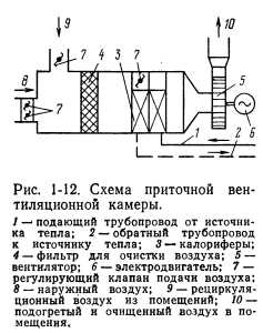 ВЕНТИЛЯЦИЯНазначением вентиляции является обеспечение соответствия качественного состава воздуха при определенной температуре требованиям: 1) санитарных норм, регламентирующих содержание в воздухе кислорода, углекислого газа, пыли, различных паров, запахов и ядовитых веществ, а также температуру воздуха в помещениях; 2) противопожарных норм, определяющих предельно допустимое содержание в воздухе помещений горючих и взрывоопасных газов и пыли. Для удовлетворения этих требований надо удалять из производственных, общественных и жилых помещений загрязненный воздух, потерявший свой нормальный состав, и вводить вместо него свежий, незагрязненный воздух из атмосферы. Интенсивность воздушного обмена зависит от интенсивности процесса загрязнения воздуха в помещении. Кратность воздухообмена колеблется в очень широких пределах — от однократного до десятикратного обмена воздуха в час, а в таких цехах, как гальванический, шлифовки и окраски древесины, достигает даже сорокапяти-кратного обмена в час. Температура поступающего свежего воздуха зависит от необходимой температуры внутри помещения, а также от процессов, протекающих в помещении. Зимой, когда в помещениях имеются значительные тепловыделения, свежий воздух подводится с пониженной температурой по отношению к температуре, необходимой для данного помещения. Если вентиляция должна возместить теплопотери помещения, то температура подводимого свежего воздуха должна быть выше, чем температура воздуха помещения. Весной поступающий в помещения воздух подогревают до того уровня, пока среднесуточная температура наружного воздуха не сравняется с температурой, поддерживаемой в помещениях. Летом температуру наружного воздуха, поступающего в вентилируемые помещения (при отсутствии кондиционирования), не меняют. Тепло, служащее для нагрева наружного воздуха до температуры помещения, называют теплом, расходуемым на вентиляцию. Существуют следующие три вида вентиляции: 1. Естественная вентиляция, происходящая благодаря обмену воздуха через окна, двери, вентиляционные отверстия, аэрационные проемы, дефлекторы, печи и неплотности в наружных ограждениях здания. Обмен воздуха совершается постоянно путем фильтрации и периодически при открывании окон, дверей и т. п. Интенсивность естественной вентиляции может достичь трехкратного обмена воздуха в час. Однако естественный обмен воздуха происходит неравномерно в разных частях помещения. Например, весьма слаба вентиляция пространства, расположенного над окнами помещения. При естественной вентиляции свежий воздух из атмосферы неорганизованно смешивается с загрязненным воздухом помещения. В результате смешения чистого, а зимой и холодного воздуха с загрязненным теплым воздухом воздушная среда помещения приобретает другой, состав и температуру. В итоге выводимый из помещений воздух при естественной вентиляции является нагретой смесью загрязненного и чистого воздуха. Уход части нагретого чистого воздуха из помещений и связанная с этим потеря тепла является одним из недостатков естественной вентиляции. Приточный воздух нагревает или охлаждает воздух помещения. Поскольку при естественной вентиляции не применяются устройства для подогрева приточного воздуха, то в отопительный период подогрев осуществляется за сч