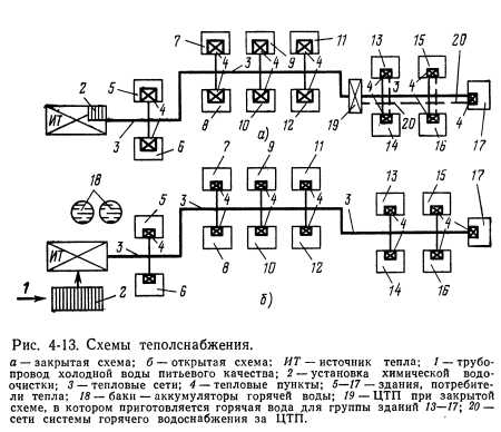 ЗАКРЫТЫЕ И ОТКРЫТЫЕ СХЕМЫ ТЕПЛОСНАВЖЕНИЯСистемы теплоснабжения, в которых в качестве теплоносителя применяется горячая вода, могут работать по различным схемам присоединения потребителей. Основные применяемые на практике схемы теплоснабжения разделяются по следующим признакам. 1. По способу присоединения местных систем горячего водоснабжения, обеспечивающих санитарно-бытовые и технологические нужды: а) закрытые схемы; б) открытые схемы. 2. По способу присоединения местных систем отопления, вентиляции и кондиционирования воздуха: а) зависимые схемы; б) независимые схемы. В закрытой схеме теплоснабжения теплоноситель используется только для транспортирования тепла. Теплоноситель не расходуется и не отбирается из сети (не считая нормированных потерь — утечек и аварийных случаев). В открытой схеме теплоснабжения теплоноситель (т. е. горячая вода) служит не только для транспортирования тепла, но также отбирается из сети потребителями для горячего водоснабжения санитарно-бытовых и технологических нужд производства. Выбор закрытой или открытой схем теплоснабжения потребителей существенно влияет на технологическую Схему, стоимость строительства и эксплуатацию отдельных элементов системы теплоснабжения и связанных с ней объектов. В наибольшей степени это влияние сказывается на: 1) источнике тепла, стоимости его строительства и эксплуатационных затратах; 2) габаритах, оборудовании, строительных и эксплуатационных затратах тепловых пунктов потребителей; 3) числе и диаметрах трубопроводов тепловой сети; ![]() 4) капитальных затратах и эксплуатационных расходах потребителей тепла в связи с различиями в габаритах и технологических схемах тепловых пунктов в закрытой и открытой схемах; 5) количестве эксплуатационного персонала, обслуживающего систему теплоснабжения в целом, а также отдельных ее элементов; 6) работе и стоимости хозяйственно-питьевого водопровода города. На рис. 4-13 схематически изображены закрытая и открытая схемы теплоснабжения (при закрытой или открытой схемах присоединения потребителей), Капитальные вложения в строительство и эксплуатационные расходы источника тепла для закрытых схем меньше, чем у открытых вследствие упрощения химической водоочистки и отсутствия крупных баков — аккумуляторов горячей воды. В ходе эксплуатации таких источников тепла химической очистке подвергается только относительно небольшое количество воды, идущей на возмещение потерь теплоносителя в системе источника тепла и теплоснабжения. Основное удобство и простота эксплуатации источника тепла в закрытой схеме заключаются в том, что от него не требуется обеспечения местных систем горячего водоснабжения потребителей горячей водой питьевого качества. Это означает, что теплоноситель— горячая вода, циркулирующая в системе теплоснабжения при закрытой схеме, может по цвету, запаху или вкусу не соответствовать воде питьевого качества. Единственное требование, предъявляемся к воде, служащей для пополнения системы, состоит в том, что она должна быть деаэрирована и умягчена во избежание кислородной коррозии и накипеобразования в системе теплоснабжения. Тепловые сети при закрытой схеме могут подать потребителю несколько меньшее количество тепла, чем сети того же диаметра, работающие при открытой схеме. При горячем водос