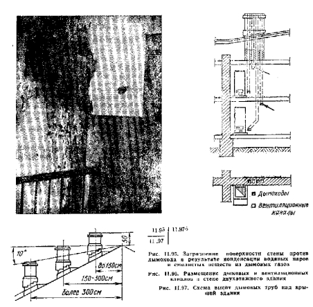 Дымовые трубы и немалыДля отвода дымовых газов от печей, как уже указывалось, устраивают насадные и отдельно стоящие (коренные) дымовые трубы или внутристенные дымовые каналы. В кирпичных зданиях следует устраивать дымовые каналы во внутренних капитальных стенах. В некоторых случаях приходится прокладывать дымовые каналы в наружных стенах. При этом возможна конденсация водяных паров и смолистых веществ, потеря тяги и пр., что заставляет утолщать стену с таким расчетом/чтобы расстояние от дыма до наружной поверхности стены было только на 1/2 кирпича меньше общей толщины стены. Конденсация водяных и смолистых веществ из дымовых газов возможна не только в каналах наружных стен, ной в каналах, устроенных во внутренних стенах лестничных клеток. На рис. 11.95 и оказана темно-серая пятнистая полоса на поверхности внутренней стены лестничной клетки жилого дома против дымохода плиты ресторана, находящегося в первом этаже. Такая обильная конденсация водяных паров и смолистых веществ на поверхности дымохода произошла из-за того, что в сильные морозы температура в лестничной клетке понизилась до отрицательной. Дымовые каналы должны быть вертикальными. Если почему-либо приходится отводить каналы в сторону, то «увод> канала допускается на расстояние не более 1 м и под углом не менее 60° к горизонту. Толщина стенки дымовых каналов должна быть не менее 1/2 кирпича. Рядом с дымовыми каналами рекомендуется предусматривать вентиляционные вытяжные каналы. Размещение дымовых и вентиляционных каналов в стене двухэтажного здания и порядок присоединения их к общей головке трубы показаны на рис. 11.96. Для обеспечения хорошей тяги высота трубы, считая от уровня колосниковой решетки до устья трубы, должна быть не менее Г> м и должна выводиться выше крыши здания в зависимости от расстояния до сс конька, как показано на рис. 11.97. При устройстве дымовой трубы D местах прохода головки через крышу выкладывают напуск кирпича. Щели между трубой и кровлей тщательно заделывают листовой сталью. Размеры дымовых труб и каналов определяют исходя из скорости движения дымовых газов 1,5 и/с. Температуру газов в дымовой трубе или канале принимают 130—150°С в зависимости от рода сжигаемого топлива. Наименьший размер площади сечения дымовой трубы 1/2Х X1/2 кирпича, т. е. 140X140 мм, для печей с тепловой мощностью при двух топках в сутки не более 3500 Вт и 1/2X1 —кирпич — при большей тепловой мощности; Печь присоединяют к каналу или отдельно стоящей трубе через короткий кирпичный патрубок или перекидной кирпичный рукав, длина которого но должна быть больше 2 м. Для патрубков и рукавов можно использовать армированные жаростойкие бетонные трубы, а также напорные асбестоцементные трубы без стыков по длине с изоляцией их слоем асбеста толщиной 3 см и со штукатуркой но металлической сетке. ![]() |