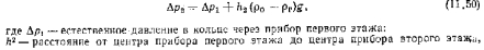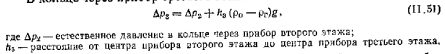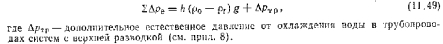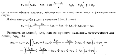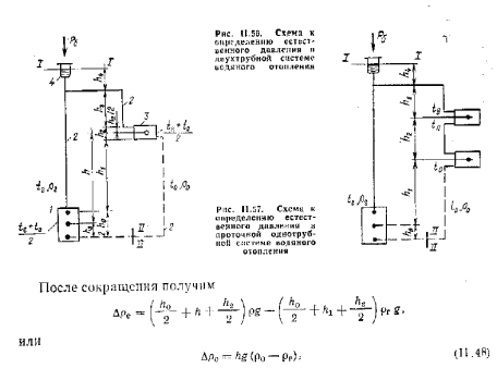 Естественное давление, возникающее в системах водяного отопленияКак было сказано, в результате охлаждения воды в нагревательных приборах и трубопроводе возникает естественное давление. Определим величину его в системе отопления, элементарная схема которой приведена на рис. 11.56. Система состоит из котла 1, трубопроводов 2, соединяющих котел с нагревательным прибором 3, и расширительного сосуда 4. Предположим, что все трубопроводы системы имеют хорошую теплоизоляцию и вода при движении от котла в нагревательный прибор не охлаждается. При этих условиях плотность и температура воды будут изменяться только в двух точках циркуляционного кольца — в котле и в нагрев а тельном приборе. С достаточной для практических целей точностью принимаем среднюю температуру воды в котле и в приборе равной средней температуре горячей и охлажденной воды: ср=(г4- + /0)/2 при плотности рср=(рг+рс)/2. Для циркуляции воды в системе необходима разность давления в любом сечении трубопровода кольца. Возьмем произвольно сечение II—II нижней трубы и определим давления справа и слева. Так как в котле вода нагревается, а охлаждается только в приборе, то давление столба воды в сечении II—II справа будет равно ![]() ![]() Таким образом, естественное давление равно произведению вертикального расстояния от середины котла (центра нагрева) до середины нагревательного прибора (центра охлаждения) на разность плотностей (объемных масс) охлажденной и горячей воды. Кроме того, из формулы (II.48) и схемы системы отопления, показанной на рис. 11.56, видно следующее: атмосферное давление и высота расположения расширительною сосуда влияния на величину естественного давления не оказывают; для пивышения естественного давления необходимо заглублять котел, чтобы расстояние от центра котла до центра прибора было больше. При выводе формулы для определения естественного давления было допущено, что вода, движущаяся в системе, охлаждается только в нагревательном приборе. В действительности она охлаждается и в трубопроводах системы. Общая величина естественного давления 2,Лре, Па, в кольце системы с учетом дополнительного давления, возникающего вследствие охлаждения воды в трубопроводах: ![]() В системах с нижней разводкой охлаждение воды в подъемных стояках (горячих) уменью ант действующее давление, а в опускных (обратных) увеличивает. Поскольку уменьшение, примерно равно увеличению, то в системах с нижней разводкой охлаждение воды в трубопроводах не учитывается, В зданиях в два этажа и выше число циркуляционных колец в двухтрубной системе отопления равно числу нагревательных приборов (без учета приборов, присоединенных на «сцепке»). Очевидно, что в кольце, проходящем через прибор второго этажа, естественное давление Арч, Па, равно ![]() ![]() Избыточное давление для приборов верхних этажей приводит к более интенсивному движению воды н ответвлениях к прибору, в приборе и в обратном стояке, что вызывает перегрев приборов верхних этажей и недогрев приборов нижних этажей. Поэтому приходится на этих участках трубопровода искусственно создавать повышенные сопротивления, а при монтажной регулировке системы поэтажно изменять степень открытия кранов у отопительных приборов. В однотрубной системе число циркуляционных колец равно числу отопительных стояков. Вода охлаждается последовательно в п
