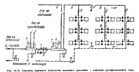 Конструктивные особенности систем парового отопления высокого давленияПаровое отопление высокого давления обычно применяют в тех случаях, когда пар вырабатывается в заводских котельных и основным потребителем его является производство. Узел управления и схема парового отопления высокого давления с верхним распределением пара показаны на рис. П.79. Пар из котельной поступает в узел управления с давлением ршо~0,6 МПа. Пар такого давления требуется производству. Для распределения пара установлен парораспределительный коллектор i с двумя ответвлениями. Так как для системы отопления здания пар может быть использован с давлением pv не выше 0,3 МПа, то для понижения давления с 0,6 до 0,3 МПа перед вторым парораспределительным коллектором установлен редукционный клапан 2 с обводной линией 5 (на случай ремонта). После редукционного клапана установлен предохранительный клапан рычажного типа 4, отрегулированный на ризб=0,3 МПа. Для наблюдения за давлением на коллекторах имеются манометры 5. Из второго парораспределительного коллектора нар поступает по главным стоякам и паропроводам 6 и отопительным стоякам 7 в нагревательные приборы. У приборов на паровой и конденсационной подводках установлены вентили 9; они необходимы для того, чтобы уменьшать пропуск пара в конденсатенровод и выключать приборы. В системе парового отопления высокого давления возникают значительные термические удлинення трубопроводов (до 1,5—2 мм на 1 м). Для компенсации удлинений используют повороты трубопровода и на прямолинейных магистральных трубопроводах устанавливают компенсаторы 8. ![]() Системы парового отопления высокого давления применяют только разомкнутые, т. с. с конденсационным баком и насосом для перекачки конденсата. Для предотвращения прорыва пара из отопительных приборов в кондспсатопровод и конденсационный бак устанавливают конденсатоотводчики 10 или подпорные шайбы, которые пропускают конденсат и задерживают пар. |