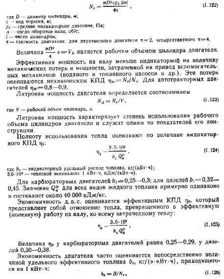 Мощность и коэффициент полезного действия двигателя внутреннего сгоранияРазличают следующие виды мощности д.в.с.: индикаторную (внутреннюю) Nu развиваемую рабочим телом в цилиндрах двигателя, эффективную Nt получаемую на валу двигателя, и литровую л, отнесенную к рабочему объему цилиндра. Индикаторная мощность двигателя ЛД Вт, определяется по формуле ![]() Удельный эффективный расход топлива &е ДЛЯ современных карбюраторных двигателей при работе на номинальном режиме составляет 0,22—0,30 кг/(э- кВт-ч), а для дизеля 0,16—0,22 кг/(э-кВт-ч), т. е. примерно в 1,5 раза меньше. |