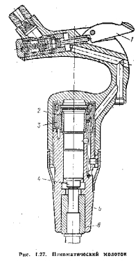 Область применения сжатого воздуха в строительствеВ строительстве сжатый воздух применяется для механизации многих трудоемких процессов {разборка старых сооружений, рыхление мерзлых грунтов и твердых пород, вскрытие дорожных покрытий, понижение уровня грунтовых вод и др.). Сжатый воздух используется также для транспортировки строительных материалов, в пескоструйных аппаратах, для нанесения покрытий, подъема воды из подземных источников (эрлифты) и т. п. Сжатый воздух обладает рядом свойств, облегчающих его использование: он упруг, быстро передает колебания, прозрачен, легко поддается транспортировке, не конденсируется и не опасен в пожарном отношении. К наиболее, распространенным пневматическим инструментам, применяемым в строительстве, относятся молоток, трамбовка, сверлильная машина. Работа многих инструментов основана на ударном и вращательном действии их элементов. Пневматические инструменты различного назначения благодаря небольшой массе, простоте в обращении и безопасности в эксплуатации находят все более широкое применение. На рис. 1.27 показан пневматический молоток, работа которого основана на ударном действии. Принцип его работы заключается в следующем. К молотку через шланг подводится сжатый воздух, который при нажатии на курок 1 поступает в воздухораспределительный механизм, состоящий из золотниковой коробки 3 и золотника 2. Поступая в полость ствола 5, воздух перемещает ударник 4 вверх и вниз по каналу ствола. Ударник, движущийся с большой скоростью, ударяет по хвостовику в вставленного инструмента. ![]() К пневматическим инструментам, работа которых основана на вращении отдельных элементов, относятся пневматические ключи, щетки, напильники, дрели и др. |