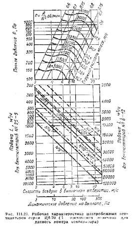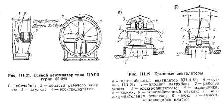 Общие сведения о вентиляторахКак было отмечено раньше, радиус действия системы естественной вентиляции принимают не более 8 м из-за малой величины действующего в пей естественного давления. Этот недостаток системы усугубляется в приточной вентиляции вследствие значительных сопротивлений оборудования приточной камеры. ![]() В настоящее время в общественных и производственных зданиях устраивают преимущественно механическую вентиляцию, в которой воздух перемещается по сети воздуховодов и другим элементам системы с помощью центробежных и осевых вентиляторов, приводимых в действие электродвигателями. Центробежные вентиляторы. Обычный центробежный вентилятор (рис. III. 19) состоит из трех основных частей: рабочего долее а с лопатками (иногда называемого ротором), улиткообразного кожуха и станины с валом, шкивом и подшипниками. Работа центробежного вентилятора заключается в следующей: при вращении рабочего колеса воздух поступает через входное отверстий каналы между лопатками колеса, под действием центробежной силы перемещается по этим каналам, собирается спиральным кожухом и направляется в его выходное отверстие. Таким образом, воздух в центробежный вентилятор поступает в осевом направлении и выходит из него в направлении, перпендикулярном оси. Центробежные вентиляторы различают по направлению вращения колеса. Если смотреть со стороны, противоположной входному отверстию, то вентилятор, н котором рабочее колесо вращается по часовой стрелке, называется вентилятором правого вращения, а против часовой стрелки — левого вращения. Колесо вентилятора должно вращаться всегда по ходу разворота спирального (улиткообразного) кожуха, так как при обратном вращении колеса подача вентилятора резко (примерно на 70—80%) уменьшается. Вентилятору присваивается номер, соответствующий диаметру колеса в (дециметрах). Так, например, вентилятор № 5 имеет наружный диаметр рабочего колеса 5 дм (500 мм), АЬ 8- 3 дм {300 мм) и т.д. В настоящее время центробежные вентиляторы выпускаются промышленностью сериями с колесами от 200 (№ 2) до 1000 мм (№ 10) через каждые 100 мм и от 1000 до 2000 мм через 200 мм. Центробежные вентиляторы одной и той же серии и и о мёр а изготовляют с кожухами, имеющими различное направление выхода воздуха (рис. 111,20). По создаваемому давлению центробежные вентиляторы делятся па группы: низкого давления (и, д.) — до 1000 Па (100 кге/м3); среднего давления (с.д) —до 3000 Па (300 кге/м2); высокого давления (в. д.) —до 12 000 Па (1200 кге/м2). В системах вентиляции более широкое применение находят центробежные вентиляторы низкого давления. Центробежные вентиляторы высокого давления используют для пневматического транспорта и других производственных целей. Осевые вентиляторы. Простейший осевой вентилятор ЦАГИ серии Об—320 (рис, 1П.21) состоит из рабочего колеса, закрепленного на втулке и насаженного па вал электродвигателя, и кожуха (обечайки), назначение которого — создавать направленный поток воздуха. При вращении колеся возникает движение воздуха вдоль оси вентилятора, что И определяет его назван не. ![]() Внутренний диаметр кожуха (обечайки) осевого вентилятора немного больше диаметра колеса, Зазор, который образуется we жду кожухом и колесом, не должен превышать 1,5% длины лопатки, так как большой зазор резко ухудшает аэродинамические качества вентилятора. ![]() Осевой