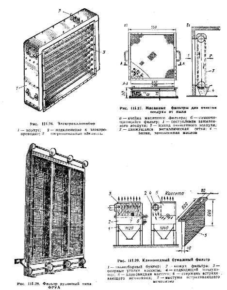 Очистка наружного воздуха от пыли и микроорганизмовРанее было указано, что при механической приточной вентиляции наружный воздух до подачи его в помещение нередко очищается от вредных механических примесей. Согласно СНн11 11-33-75, очистку подаваемого воздуха от пыли рекомендуется предусматривать: в общественных зданиях (при соответствующем санитарно-гигиеническом обосновании); в производственных помещениях, когда этого требует технологический процесс и когда запыленность воздуха превышает 30% допустимых концентраций ныли в рабочей зоне помещения. Для очистки подаваемого в помещения воздуха от пыли в приточных камерах применяют специальные фильтры (масляные, бумажные, тканевые и др.), устанавливая их до калориферов (по направлению потока воздуха). На рис. ПТ.27, а показана ячейка масляного фильтра, представляющая собой металлическую съемную кассету размером 510X510X75 мм, затянутую с обеих сторон сеткой. Все пространство между сетками заполняется металлическими или фарфоровыми кольцами небольшого размера или другими фильтрующими материалами. Масляный фильтр собирается в металлическом каркасе из нескольких ячеек, расположенных горизонтально, вертикально или наклонно. До постановки ячеек на место наполнитель — фильтрующий материал— должен быть смочен минеральным маслом, обладающим большой вязкостью, температуроустойчивостью и не имеющим запаха. При прохождении запыленного воздуха через фильтр частички пыли прилипают к смоченной маслом поверхности наполнителя. Для регенерации масла ячейки фильтра периодически промывают в 10%-ном содовом растворе, нагретом до 50—70° С, а затем опускают в ванну, заполненную маслом. К разновидностям рассмотренного масляного фильтра относятся ячейковый фильтр модели ФЯР с гофрированной латунной или стальной оцинкованной сеткой и ячейковый фильтр модели ФЯБ с гофрированной нинипластовой сеткой. Пропускная способность 1 м2 масляных ячейковых фильтров составляет от 4000 до 6500 м3/ч. Коэффициент очистки от пыли достигает в лих 90“/о . ![]() Периодическая ручная очистка ячейкового фильтра кассетного типа побудила конструкторив разработать самоочищающийся масляный фильтр {рис. 111.27, б). В нем в качестве фильтрующего элемента ис- пользуются бесконечные ленты из металлической сетки, которые приводятся в движение электродвигателем. Ленты при этом очищаются от осевшей ка них пыли в масляной ванне, в которую они погружаются. Пропускная способность фильтра 8000—10000 м-у(ч-м3). Современными и более эффективными фильтрами этого типа являются шарнирно-шторчатые масляные самоочищающиеся фильтры (ФШ) С механизированным удалением шлама. Для тонкой очистки воздуха с содержанием пыли не более 1 мг/м3 промышленность выпускает фильтры ячейковые сухие ФЯП и ФЯУ. Заполнителем и фильтре ФЯП служит модифицированный пенополиуретан, а в фильтре ФЯ — упругое стекловолокно ФСВУ, Пропускная способность ячейки унифицированных фильтров (ФЯУ) при удельной воздушной нагрузке 70U0 м3/(ч-м3) составляет 1540 м3/ч. На рис. 111.28 показан фильтр рулонный типа ФРУА, предназначенный для очистки наружного или рециркуляционного воздуха при запыленности его от десятых долей до 1 MI/M3. Фильтр ФРУА представляет собой коробчатый каркас, через сечение которого проходит очищаемый воздух. В верхней и нижней частях каркаса установлены катушки. На вер