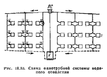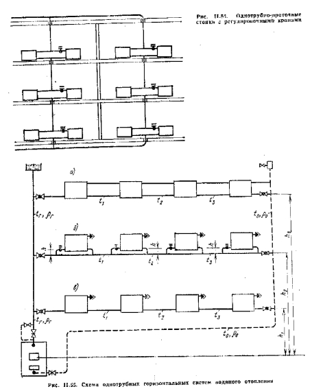 Основные схемы систем водяного отопления с естественной циркуляцией водыСистемы водяного отопления с естественной циркуляцией воды подразделяются: по месту расположения горячего магистрального трубопровода-— на системы с верхней и нижней разводкой (вертикальные) и системы с поэтажной разводкой (горизонтальные); по конструкции отопительных стойкой — на двухтрубные и однотрубные. В системах, показанных на рис, 11.51 и 11.52, имеются два отдельных стояка; по одному из них — горячему стояку —вода поступает н нагревательные приборы, по другому — обратному стояку она отводится нз них. По этому признаку системы называют двухтрубными. ![]() ![]() В системе с замыкающими участками горячая вода, движущаяся по стояку, в узлах присоединения приборов разделяется па два потока: часть воды затекает в приборы, а другая часть проходит по замыкающему участку. Вода, охладившаяся в приборах, смешивается с горячей водой, проходящей по стояку, и далее поступает в расположенный ниже прибор. В проточной системе вся горячая вода проходит последовательно через все приборы, присоединенные к стояку (ветке). Однотрубные проточные системы отопления отличаются простотой конструкции и удобством монтажа. Однако невозможность выключения и регулирования отдельных приборов при одностороннем расположении их по отношению к стояку ограничивает применение этой схемы. На рис. 11.54 показана однотрубная проточная система, предложенная проф, П. Н. Каменевым. Особенность ее состоит в том, что приборы, находящиеся в одном помещении, присоединяют по проточной схеме к стояку с двух сторон и у одного из них устанавливают регулировочный кран. Такие системы находят применение в многоэтажных промышленных зданиях. На рис. 11.55 показана схема однотрубных горизонтальных систем отопления. Горячая вода в таких системах поступает в отопительные приборы одного н того же этажа из теплопровода, проложенного горизонтально. Регулировка и включение отдельных приборов в горизонтальных системах с замыкающими участками (рис. 11.55, б) достигается так же легко, как и в вертикальных системах, В горизонтальных проточных системах (рис. 11.55, а, в) регулировка может быть только поэтажная, что является существенным их недостатком. К основным достоинствам однотрубных горизонтальных систем относятся меньше, чем в вертикальных системах, расход труб, возможность поэтажного включения системы и стандартность узлов. Горизонтальные системы не требуют пробивки отверстий в перекрытиях, и монтаж их по сравнению с вертикальными системами проще. Они довольно широко применяются в производственных помещениях. |