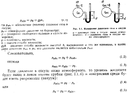 Основные параметры состояния газа и их единицы измеренияК основным параметрам состояния газов относятся; давление, абсолютная температура и удельный объем. Давление. Давлением вообще называется сила, действующая на единицу площади поверхности тела перпендикулярно последней. Давление газа есть средний результат силового воздействия громадного числа молекул газа на внутреннюю поверхность сосуда, в котором заключен газ. Молекулы газа, находясь все время в движении, ударяются о поверхность сосуда и тем самым «давят» на его стенки, В технике различают абсолютное давление раеС, избыточное давление рпэб и разрежение р3. Под абсолютным давлением подразумевается полное давление, под которым находится газ. Под избыточным давлением понимают разность между абсолютным давлением, большим, чем атмосферное, и атмосферным давлением. Разрежение (вакуум) характеризуется разностью между атмосферным давлением и абсолютным давлением, меньшим, чем атмосферное. Рассмотрим методы измерения давления с помощью U-образной трубки, залитой жидкостью и сообщающейся с атмосферным воздухом (рис. 1.1). Если давление в сосуде выше атмосферного (рис. 1.1,а), то жидкость в правом колене трубки прибора установятся выше, чем в левом. Давление в сосуде будет, очевидно, уравновешиваться давлением атмосферного воздуха и давлением столба жидкости а трубке высотой h. Следовательно, и в правом, и в левом коленах трубки прибора а сечении с --d давление на жидкость одинаково, а отсюда можно заключить, что ![]() Приборы, служащие для измерения давления газа больше атмосферного, называются манометрами и показывают избыточное давление газа над атмосферным. В практике избыточное давление называют манометрическим давлением. Для измерения давлений меньше атмосферного применяются вакуумметры, показывающие, насколько давление газа ниже атмосферного. Устройство манометров и вакуумметров обычно основывается на уравновешивании усилий, передающихся от тела, давление которого измеряется массой жидкости или деформацией различного рода пружин, а также нагрузкой на поршень. Температура—параметр, характеризующий тепловое состояние тела. Температура тела определяет направление возможного самопроизвольного перехода тепла от тела с большей температурой к телу с меньшей температурой. В СССР для измерения температур приняты стоградусная шкала (ГОСТ 8550—61) и абсолютная гермодинамическая шкала Кельвина, В стоградусной шкале при ps™ 101,325 кПз (760 мм рт. ст.) за 0 принимается температура таяния льда, а за 100° С — температура кипения воды. Градус, этой шкалы обозначается через С. В абсолютной термодинамической шкале Кельвина за нуль принято состояние тела, при котором тепловое движение молекул теоретически отсутствует. Из физики известно, что такое состояние наступает при температуре на 273,16° (273° С) ниже 0°С. Величина градуса по шкале Кельвина принимается равной градусу по стоградусной шкале: Г К=1СС, следовательно, ![]() ![]() Кроме рассмотренных основных параметров газа существуют и другие параметры состояния: энтропия S, внутренняя энергия U и энтальпия i. Эти параметры будут рассмотрены дальше. |