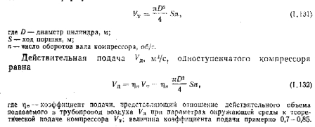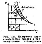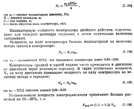 Подача и мощность поршневых компрессоровВ действительных процессах па работу компрессора влияют: наличие вредного пространства, теплообмен между всасываемым воздухом и стенками цилиндра, сопротивление клапанов, утечки и др, Рабочий цикл, отражающий действительный процесс работы компрессора, записывается, так же как и рабочий цикл двигателя внутреннего сгорания, индикатором. Теоретическая подача 1%, м3/с, одноступенчатою компрессора определяется по формуле ![]() ![]() С увеличением создаваемого давления экономичность одноступенчатого поршневого компрессора падает. Для получения воздуха высокого давления применяют многоступенчатые компрессоры, в которых процесс сжатия происходит последовательно в нескольких цилиндрах с промежуточным охлаждением воздуха в холодильниках-теплообменниках. Работа сжатия в многоступенчатом компрессоре может быть оценена как сумма сжатия в отдельных ступенях. На рис, 1,26 графически представлен термодинамический процесс, происходящий н двухступенчатом компрессоре с промежуточным охлаждением. При двухступенчатом сжатии экономия работы показана заштрихованной площадью диаграммы 2—V—2—1—2 Индикаторная мощность компрессора одинарного действия Л% Вт, определяется по формуле ![]() |