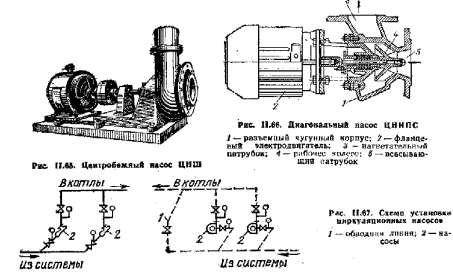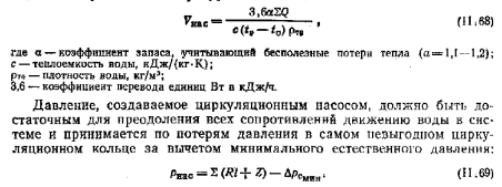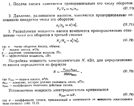 Подбор и установка циркуляционных насосовВ системе водяного отопления с искусственной циркуляцией кроме насоса для заполнения ее водой и подпитки в процессе эксплуатации устанавливают так называемые циркуляционные насосы для перемещения воды по трубопроводам. Наибольшее применение в системах отопления зданий получили насосы центробежного типа (рис. Г Т.65) хотя для отопления небольшого здания от котельной, расположенной в его габаритах, более пригодны диагональные насосы (рис. 11.66), которые вполне обеспечивают требуемое давление 1—2 м вод. ст. и соответствуют до производительности. В системе водяного отопления, как правило, устанавливают два циркуляционных насоса, включаемых поочередно. Таким образом, один насос всегда является резервным. ![]() Насосы центробежного типа присоединяют к магистральному трубопроводу охлажденной воды. Оба насоса снабжают обводной линией с задвижкой для регулирования их работы и в случае выключения электроэнергии — для поддержания в системе естественной циркуляции воды. Диагональные насосы можно устанавливать без обводной линии, так как сопротивление проходу воды через них незначительно. Принципиальная схема установки насосов показана на рис. 11,67. Для подбора циркуляционного насоса необходимо знать требуемую его подачу и расчетное давление. Требуемая подача насоса 1/нас, мг/ч, определяется тепловой нагрузкой обслуживаемой системы отопдения SQ, Вт, и перепадом температуры воды t?—<>: ![]() Требуемое давление насоса для систем отопления отдельных зданий обычно не превышает 12 кПа. Насосы подбирают по их рабочим характеристикам, которые приведены в справочниках по санитарной технике и в каталогах заводов-изготовителей. При подборе необходимо иметь в виду следующие закономерности. ![]() ![]() При установке циркуляционных насосов особое внимание должно уделяться борьбе с шумом, возникающим при их работе. С этой целью устраивают фундаменты специальной конструкции, не связанные со строительными элементами здания; применяют звукопоглощающие прокладки, вставки на трубопроводах из прорезиненного шланга и другие средства пи снижению шума и предотвращению его распространения по зданию. |