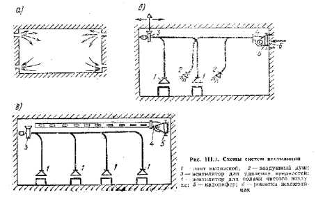 Понятие о способах организации воздухообмена и устройстве систем вентиляцииВоздушная среда в помещении, удовлетворяющая санитарным нормам обеспечивается в результате удаления загрязненного воздуха из помещения и подачи чистого наружного воздуха. Соответственно этому системы вентиляции подразделяют на вытяжные и приточные. По способу перемещения удаляемого из помещений и подаваемого в помещения воздуха различают вентиляцию естественную (неорганизованную и организованную) и механическую (искусственную). Под неорганизованной естественной вентиляцией понимают воздухообмен в помещениях, происходящий под влиянием разности наружного и внутреннего воздуха и действия негра через ограждающих конструкций, а также при открывании форточек, фрамуг и дверей. Воздухообмен, происходящей также под влиянием разности, давлений наружного и внутреннего воздуха и действ им ветра, по через специально устроенные в наружных ограждениях фрамуги, степень открытия которых с каждой стороны здания регулируется, является вентиляцией естественной, но организованной. Этот вид вентиляции называется аэрацией. Механической, или искусственной, вентиляцией называется способ подачи воздуха в помещение или удаления из него с помощью вентилятора. Такой способ воздухообмена является более совершенным, так как воздух, подаваемый в помещение, может быть специально подготовленным в отношении его чистоты, температуры и влажности. Системы механической вентиляции, автоматически поддерживающие D помещениях метеорологические условия на уровне заданных независимо от изменяющихся параметров внешней воздушной среды, называются системами кондиционировании воздуха (condition —- условие). По способу организации воздухообмена в помещениях вентиляция может быть общей, местной, локализирующей, смешанной н аварийной. Общая вентиляция, называемая обще-обменной, предусматривает и для создания одинаковых условий воздушной среды (температуры, влажности, чистоты воздуха и его подвижности) во всем помещении, главным образом в рабочей зоне {#=1,5—2 м от пола) (рис. ПЫ,а). ![]() Местная вентиляция создает местные (на рабочих местах), отвечающие гигиеническим требованиям условия воздушной среды, отличные от условий в остальной части .помещения. Примером местной приточной вентиляции может служить воздушный душ—-струя воздуха, направленная непосредственно на рабочее место (рис. Ш.1, б). Принцип действия локализирующей вентиляции заключается в улавливании вредных выделений непосредственно у производственных установок е помощью специальных укрытий, предотвращающих поступление вредных выделений в помещение. Смешанные системы, применяемые главным образом в производственных помещениях, представляют собой комбинации общеобмешюн вентиляции с местной (рис. Ш.1, в). «Аварийные» вентиляционные установки предусматривают в помещениях, в которых возможно внезапное неожиданное выделение вредных веществ в количествах, значительно превышающих допустимые. Эта установки включают только в случае, если необходимо быстро удалить вредные выделения. Вопрос о том, какую из перечисленных систем вентиляции следует устраивать, решается в каждом отдельном случае в зависимости от назначения помещения, характера вредных выделений, возникающих в нем, и схемы движения воздушных потоков вн
