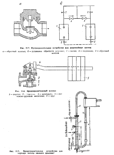 Предохранительные устройства и контрольно-измерительные приборыЧугунные секционные котлы — водогрейные — предназначены для нагрева воды до 115° С, но при установке паросборников, соответствующей арматуры и приборов они могут быть использованы как паровые при до 70 кПа. Котлы с такими параметрами теплоносителя относятся к категории низкого давления, по и для этих котлов предусматривают устройства, обеспечивающие безопасность их работы. Для водогрейных котлов предохраняющим устройством от повышения в них давления могут служить обводные линии с обратными клапанами (рис. II.7), пропускающие воду R направлении от котла к трубопроводу системы отопления. При таком несложном устройстве, если задвижки, установленные у котла, почему-либо окажутся закрытыми, то все равно связь с атмосферой через расширительный сосуд не нарушится. Если на трубопроводе между котлами и расширительным сосудом кроме указанных задвижек имеется другая какая-либо запорная арматура, то должны быть установлены рычажные предохранительные кла- шаны (рис. II.8). ![]() Паровые котлы при 60 до 70 кПа снабжаются предохранительным устройством в виде гидравлического затвора. Схема одного из таких предохранительных устройств приведена па рис. 11.9. Сущность его работы состоит в следующем: для зарядки предохранительного устройства открывают вентиль 1 на водопроводной трубе и контрольный кран 2, установленный па трубе 3. Трубы 3t 4 и 5 заполняют до тех пор,, пика вода не потечет из крана 2. Высота трубы 4 определяется по рабочему давлению пара в котле (при рабочем давлении риаб = 50 кПа ее высота Я=5+1 — 6 м). При давлении пара в котле вы/не допустимого предела уровень воды в трубе 3 доходит до низа трубы 5, после чего уравновешивающий столб воды при дальнейшем превышении давления уже не увеличивается и вода выбрасывается в бак, открывая выход пару из котла через трубу 5 и бак в атмосферу. Труба 4 служит для возврата воды из бака в затвор после снижения давления. Для безопасной и правильной эксплуатации паровые котлы кроме предохранительных устройств снабжают водоуказательными приборами, пробочными кранами и манометрами: водоуказательные приборы присоединяют к паровому и водяному пространству котла; пробочные краны устанавливают вместо второго водоуказательного прибора на котлах небольшой тепловой мощности; манометр соединяется с паровым пространством котла с помощью сифонной трубки с трехходовым краном. Для учета расхода питательной воды, подаваемой в паровой котел, или воды, циркулирующей в системе водяного отопления, устанавливают водомер или диафрагмы. Для измерения температуры воды, поступающей в систему водяного отопления и возвращающейся в коте л, предусматривают в специальных футлярах (гильзах) термометры. D системах водяного отопления с искусственной циркуляцией у каждого насоса должны быть два манометра; один—на всасывающем патрубке перед насосом, а другой па напорном после насоса. Кроме того, рекомендуется применять регулятор горения, обеспечивающий получение заданной температуры горячей воды, а также автоматическое включение подпитки системы водой при минимальном уровне стояния ее » расширительном сосуде и выключение подпитки при достижении максимального уровня. |