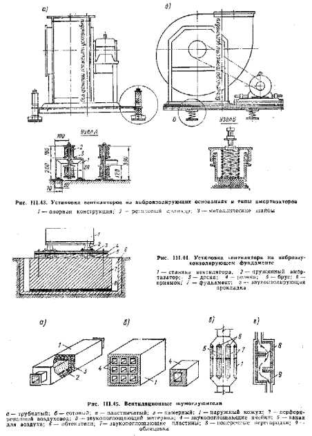 Шум в механических системах вентиляции и борьба с нимОсновным источником шума в механических системах вентиляции является вентиляторная установка, при работе которой возникают два вида шума — аэродинамический н механический. Аэродинамическим шум образуется вследствие них преобразования у лопастей колеса и кожуха вентилятора, главным образом на входе и выходе, а также периодических пульсаций воздуха, которые ощущаются также в виде шума. Механический шум создается от вибрации лопастного колеса, кожуха и электродвигателя, а также от подшипников, передачи и других элементов вентиляторной установки. Сильная вибрация вентиляторной установки не только отрицательно влияет на самочувствие человека, по и нередко служит помехой в технологическом процессе производства. Во многих случаях вибрация может быть причиной преждевременного износа и даже разрушения строительных конструкций зданий. Аэродинамический и механический шум, возникающий при работе вентиляторной установки, распространяется по воздушной среде, движущейся н каналах и воздуховодах, по их стенкам или по массиву, в котором они проложены. Кроме того, шум распространяется через основание и фундамент вентиляторной установки по ограждающим конструкциям здания, через которые проникает в помещения, и hoi да довольно далеко расположенные от вентиляторной камеры. Для борьбы с шумом вентиляторных установок снижают окружную скорость вращения рабочего колеса вентилятора, скорость движения воздуха в воздуховодах и других элементах системы вентиляции, а также проводят конструктивные и монтажные мероприятия. По условиям относительной бесшумности рекомендуются окружные скорости вращения рабочего колеса вентилятора: для осе вых вентиля то роз, устанавливаемых в жилых и общественных зданиях, не выше 35 м/с, а для центробежных 25—30 м/с; в производственных зданиях окружные скорости принимают с учетом шума от других источников, ни не пьште 50 м/с. Максимальные скорости движения воздуха в воздуховодах и других элементах системы вентиляции назначают, руководствуясь данными табл. 111.9. Для обеспечения заданного давления при небольшой окружной скорости рабочего колеса вентилятора целесообразно принимать многоступенчатую схему рабочего колеса в две ступени и более. Конструктивные и монтажные мероприятия, снижающие уровень шума, должны тщательно разрабатываться в процессе проектирования системы вентиляции здания и полностью осуществляться при монтаже ее до сдачи в эксплуатацию. Приведем некоторые вполне обоснованные указания но этому вопросу. 1. Помещения, для которых уровень шума строго регламентирован, располагать вдали от приточных и вытяжных камер. Удлинением пути, проходимого звуком от камеры до помещения, достигается ослабление уровня шума в 1 фон на 1 м. вентиляционных камер не должно быть помещений с малым уровнем собственного шума. ![]() 2. Вытяжные камеры располагать над вспомогательными помещениями (лестничными.клетка ми, санузлами и т. п.), 3. Внутренние поверхности вентиляционных камер покрывать звукопоглощающей штукатуркой или обивать материалами, хорошо поглощающими звуки различной высоты. 4. Для повышения звукоизолирующей способности дверей камер утяжелять их конструкцию, применяя доски толщиной 40—50 мм, устраивая двойные двери, и обеспечивать максималь