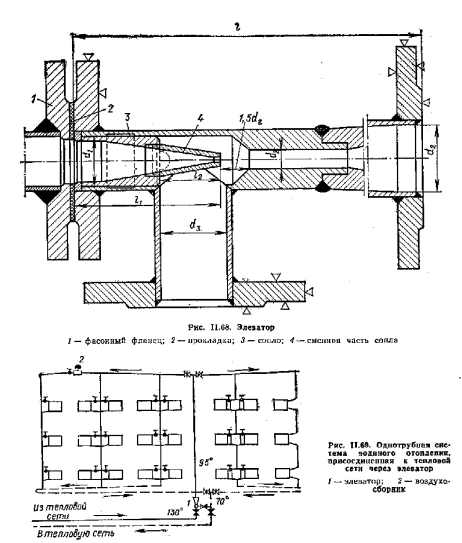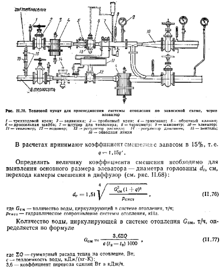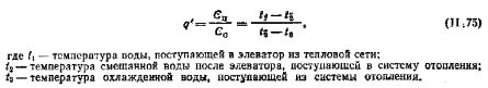 Системы водяного отопления, присоединяемые к тепловой сети через элеваторПрисоединение системы отопления к тепловой сети через элеватор имеет пока еще большое применение. Так присоединяют все ранее рассмотренные системы: однотрубные и двухтрубные, с верхней и нижней разводкой, тупиковые и с попутным движением воды. Промышленность выпускает водоструйные элеваторы чугунные и стальные. Наиболее широкое распространение получили стальные элеваторы типа ВТИ Мосэнерго (рис. 11.68), Основными частями каждого типа элеватора являются конусообразное сопло, камера всасывания, горловина и диффузор. Высокотемпературная вода, поступающая из тепловой сети в сопло элеватора, па выходе имеет большую скорость движения, за счет которой в камере всасывания давление становится значительно ниже, чем в обратной магистрали системы отопления. В результате этого охлажденная вода из системы по патрубку поступает в элеватор и смешивается с водой тепловой сети. В диффузоре скорость движения смешанной воды снижается, а давление повышается до величины, обеспечивающей циркуляцию воды ц системе отопления. Система водяного отопления, непосредственно присоединенная к тепловой сети через водоструйный элеватор, показана на рис. 11.69. Принципиальная схема теплового пункта с элеватором приведена на рис. 11.70. ![]() Основной расчетной характеристикой для элеватора служит так называемый коэффициент смешения q представляющий собой отношение массы подмешиваемой охлажденной воды Сп к массе воды Сс, поступающей из тепловой сети в элеватор: ![]() ![]() ![]() ![]() Серийный злей я тор удобно подбирать, пользуясь номограммой, приведенной В справочной литературе [24, 28], предварительно определив приведенный расход, т/ч, сметанной воды по формуле ![]() и коэффициент подмешивания по формуле (11.75). |