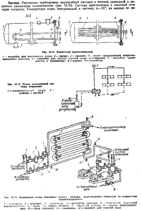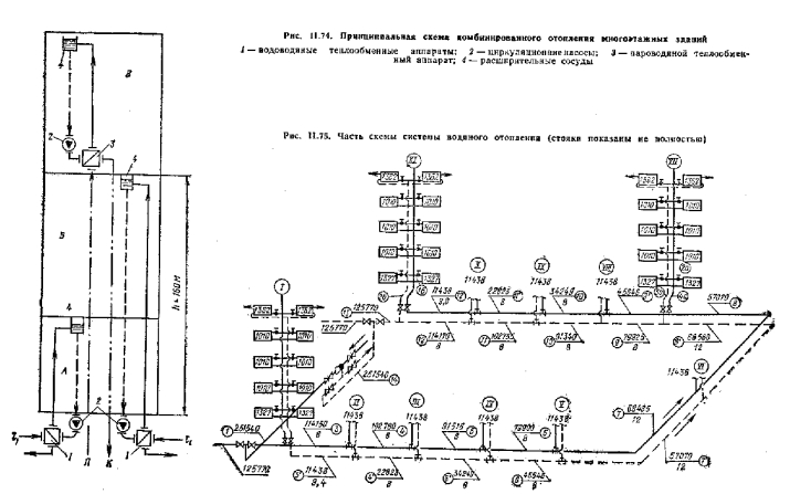 Системы пароводяного и водо-водяного отопленияСистемы пароводяного и водо-водяного отопления выполняют по любой схеме водяного отопления, но нагрев циркулирующей к них коды осуществляется в теплообменных аппаратах, называемых в практике теплоснабжения водонагревателями. Теплообменные аппараты (водонагреватели) бывают емкостные и скоростные. На рис. II.71 представлен план и разрез емкостного водонагревателя. Скоростной водонагреватель был рассмотрен в первом разделе (см. рис. 1.38). По способу побуждения пароводяные и водо-водяные системы отопления могут быть с естественной и искусственной циркуляцией. В системах с естественной циркуляцией используют емкостные водонагреватели: они отличаются незначительным сопротивлением движению воды. В системах с искусственной циркуляцией применяют скоростные водонагреватели (пароводяные и водо-водяные). На рис. 11.72 представлена схема системы пароводяного отопления с естественной циркуляцией. Пар для нагревания воды вырабатывается в котле и подается по паропроводу в теплообменный аппарат (емкостный водонагреватель). Горячая вода из водонагревателя поступает по трубопроводу в приборы системы отопления и, пройдя через них, возвращается в водонагреватель. Системы пароводяного отопления применяют в тех случаях, когда для основных теплопотребляющих систем выгоднее иметь котельную с паровыми котлами, а также когда система централизованного теплоснабжения паровая. Система водо-водяного отопления с присоединением ее к тепловой сети была кратко рассмотрена в §56. На рис. П.73 приведена примерная схема теплового пункта такой системы со скоростным водо-водяным нагревателем, рассчитанной на искусственную циркуляцию теплоносителя в ней. Системы пароводяного и водо-водяного отопления находят все большее применение в связи с повышением этажности строящихся зданий. Многоэтажные здания для уменьшения гидростатического давления па отопительные приборы нижних этажей разделяют по высоте на отдельные зоны; для каждой зоны устраивают самостоятельную систему отопления, как показано на рис. II.74. Число зон по высоте здания и высота каждой зоны определяются допустимым гидростатическим давлением как для приборов, так и для оборудования теплового пункта, который обычно размещается в подвале здания. В зданиях высотой более 160 м в верхней зоне устраивают пароводяное отопление (см. рис. 11.74). Теплоноситель пар, отличающийся незначительным гидростатическим давлением, подается в технический этаж, расположенный под верхней зоной, в тепловой пункт е пароводяными водонагревателями. В зданиях высотой более 250 м пароводяные системы отопления могут быть в двух верхних зонах и более. Методика расчета систем пароводяного и водо-водяного отопления такая же, как и систем водяного отопления. Отличие лишь в том, что определяется площадь поверхности нагрева .не котлов, а теплообменных аппаратов (водонагревателей) , которые и подбираются. Площади поверхности нагрева тсплообмекных аппаратов определяют по формулам (см. §39). ![]() ![]() ![]() ![]() ![]() ![]() |