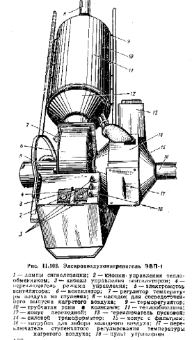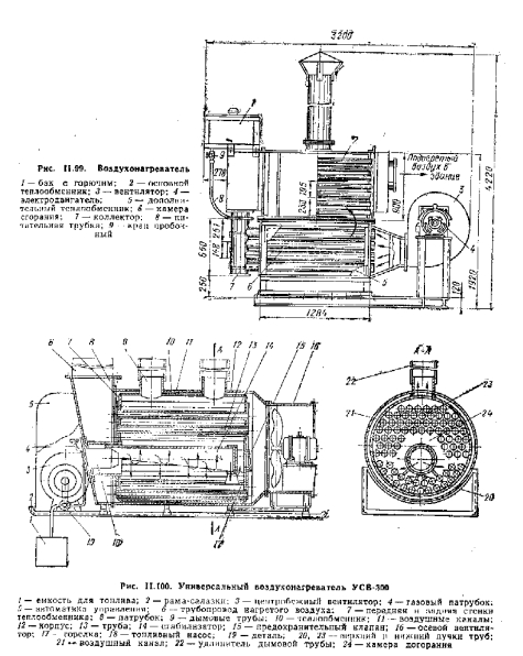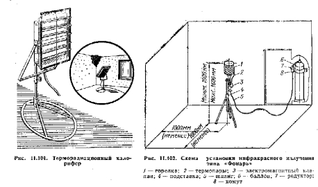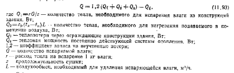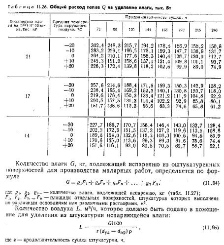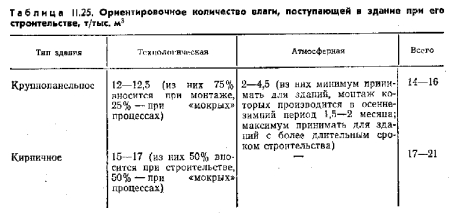 Сушка строящихся зданийОсновными источниками влажности в здании в период его строительства являются: влага, внесенная со строительными изделиями и материалами,— так называемая достроечная технологическая влага; атмосферная влага в виде осадков дождя и снега и водяные пары, содержащиеся в воздухе. Обычно Перед началом отделочных работ влажность приближается к максимальной. Содержание построечной технологической влаги в строительных материалах и изделиях может быть очень высоким и зависит от технологического процесса изготовления и качества сушки их, технологии внутренних работ и других факторов. В табл. II.24 приведены данные о построечной технологической влажности некоторых строительных материалов и изделий. ![]() При длительном хранении строительных материалов и изделий на открытом воздухе, в особенности материалов, отличающихся повышенной сорбционной способностью, влагонасыщенность их значительно возрастает. Атмосферная влага поступает в период строительства наземной части здания до устройства кровли. Для приближенного определения количества атмосферной влаги Gwt кг, вносимой в строящееся здание, может служить формула ![]() ![]() Снижение построечной технологической и атмосферной влаги в строящихся зданиях имеет большое практическое значение, особенно в условиях влажного климата или при большом количестве выпадающих осадков. Многие внутренние работы могут успешно проводиться только при определенной температуре воздуха и достаточно сухих конструкциях здания. Для ускорения сушки конструкций здания и обеспечения надлежащих условий для производства работ в настоящее время используют не только системы отопления, но и специальные тепловые установки. Ниже приводятся некоторые наиболее характерные типы этих установок. На рис. II.99 показан воздухонагреватель конструкции В. Г.. Лактюхо- ва, работающий на жидком топливе. Запас топлива в баке предусмотрен на непрерывную работу воздухонагревателя в течение 14 ч. Топливо (соляровое масло) поступает по питательному трубопроводу самотеком в бескомпрессорную форсунку. Площадь поверхности нагрева теплообменников составляет 13,5 м5. Тепловая мощность воздухонагревателя до 150 кВт, температура нагретого воздуха до 140° С, расход горючего 18 кг/ч. Воздухонагреватель устанавливают у входа в здание на предварительно выровненную площадку. Масса агрегата в сборе с обмуровкой составляет 17С0 кг. На рис. 11.100 показан универсальный строительный воздухонагреватель У СВ-300 производительностью 4500 м3/ч. Воздухонагреватель УСВ-300 состоит из корпуса цилиндрической формы, теплообменника, универсальной горелки, работающей как на жидком, так и на газообразном топливе, центробежного вентилятора для подачи воздуха в горелку, осевого вентилятора для подачи воздуха в теплообменник н топливной аппаратуры. Для улучшения эвакуации продукта сгорания топлива из теплообменника в выхлопной патрубок вмонтирована эжекционная трубщ по которой с большой скоростью проходит воздух от вентиляторa ![]() Воздухонагреватель УСВ устанавливают на расстоянии не ближе 3 м иг обогреваемого здания, При нормальной работе воздухонагрева теля температура нагретого воздуха должна находиться в пределах 80— 100° С. Это достигается путем изменения подачи топлива и воздуха в горелку. Универсальные строительные воздухона