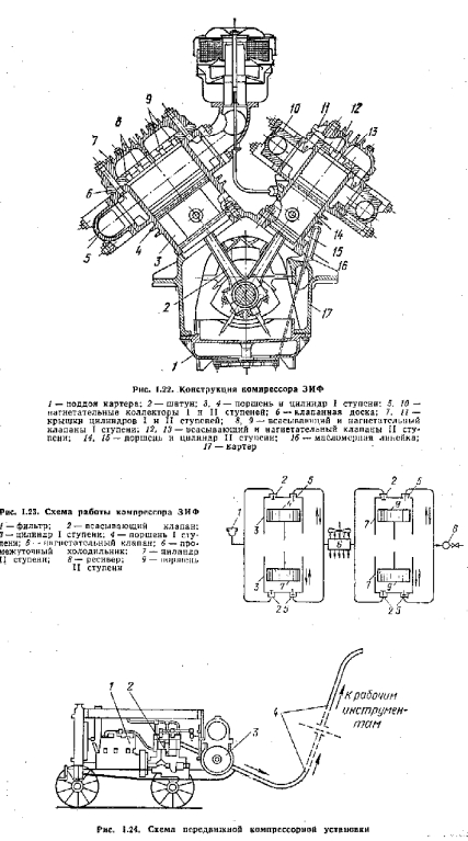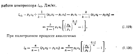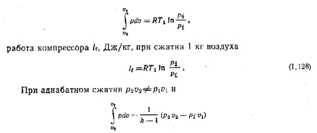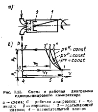 Термодинамические основы работы поршневых компрессоровПри рассмотрении процессов, происходящих в поршневом компрессоре (рис. 1.25, а), принимаем: объем, описываемый поршнем, равен объему цилиндра; сопротивление во всасывающих и нагнетательных трактах отсутствует; состояние газа в процессе всасывания и нагнетания не изменяется; влияние внешнего давления на поршень отсутствует. ![]() При выводе формулы для определения затрачиваемой, работы принимаем, что во время процесса сжатия в цилиндр поступает 1 кг воздуха. На рис. 1.25,б показана диаграмма работы поршневого компрессора в координатах р— о. Линия 0—1 отвечает процессу всасывания воздуха ![]() Известно, что площадь под линией процесса в р—о-диаграмме определяет работу. Следовательно, при изотермическом сжатии для получения заданного давления требуется затратить работы меньше, чем при адиабатном. ![]() ![]() ![]() Средняя величина показателя политропы «п», как правило, определяется но параметрам воздуха к начале и конце сжатия. С точки зрения затраты наименьшей работы изотермический процесс сжатия является наиболее выгодным. |