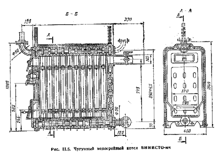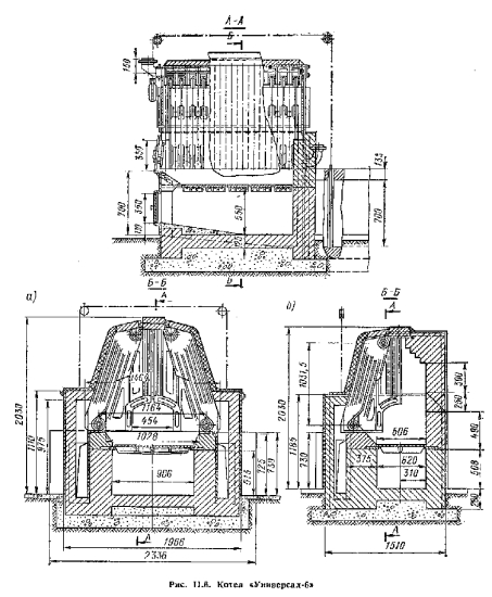 Типы котлов для теплоснабжения зданийВ отопительных котельных малой н средней мощности применяются в основном чугунные секционные котлы. В последние годы промышленность приступила к выпуску прогрессивных конструкций стальных котлов, которые в настоящее время получают применение и распространение. Технический прогресс в развитии малых отопительных котлов проявляется в сокращении поставки котлов россыпью и в оснащении их мобильными топками и надежной автоматикой. Техническая характеристика котла производится по величине поверхности нагрева (Flt, м3), т. е, по той поверхности стенок труб и барабанов котла, которая с одной стороны омывается водой, а с другой — горячими газами. Поверхность нагрева котлов измеряется по газовой стороне. С 1960 г. чугунные котлы, кроме того, стали измеряться теплотехническим показателем- -квадратным метром условной поверхности нагрева (м3 УПН), Квадратный метр условной поверхности нагрева — величина такой поверхности нагрева чугунного секционного котла, которая при работе с ручными топками на сортированном антраците и тепловом напряжении зеркала горения, равном 582 тыс. т/мг, дает 11,6 тыс. Вт тепла при КПД не менее 0,7, По виду теплоносителя котлы разделяются па водогрейные и паровые. Основными показателями водогрейного котла являются тепловая мощность, т.е. тсплопроизводительность Q, и температура воды ; основными показателями парового котла — паропроизводитсльность D, давление р и температура t. Экономичность котла оценивается его коэффициентом полезного действия, который для всех типов чугунных котлов, работающих на твердом топливе, равен 0,6—0,7, а при работе на газообразном топливе 0,8-0,85. Самыми малыми чугунными секционными котлами являются котлы системы ВНИИСТО-мч, К.ЧММ, КЧМ, устанавливаемые в небольших зданиях и отдельных квартирах. Эти котлы выпускаются промышленностью с поверхностью нагрева 0,69—4,23 м2 и тепловой мощностью 7000 - 50 000 Вт, ![]() Малометражные котлы оборудованы внутренними топками для сжигания высокосортного угля и газа. Они устанавливаются непосредственно на однорядную кладку кирпича или на лист стали по войлоку, смоченному в глиняном растворе. Для отвода продуктов сгорания топлива в верхней части котла имеется чугунный патрубок с регулирующим дроссель-клапаном. Допустимое тепловое напряжение поверхности нагрева котлов ВНИИСТО-мч при работе на сортированном антраците марки АК 9000—11 ООО Вт/м3. Чугунные секционные котлы большего размера состоят из двух пакетов (двусторонние) и редко из одного пакета (односторонние). Пакеты из секций устанавливаются ни боковые кирпичные стенки топки, которые служат основанием для котлов. Все эти котлы имеют нижний отвод дымовых газов. Для интенсификации процесса горения твердо го топлива в котлах применяют вентиляторное дутье. На рис. 11,6 показан чугунный секционный котел «Универсал-6» (КЧ-2), который является модернизацией хорошо зарекомендовавших себя котлов «Универсал».Он может быть двусторонним (рис, II.6,а) с поверхностью нагрева 19,8—46,2 м2 и односторонним (рис. П.6, б) с поверхностью нагрева 8,4—15,9 м3. Топка — внешняя (под секциями котла). Дымовые газы из топки поднимаются вверх, омывают поверхности секций и, повернув вокруг вертикальных разделительных.ребер секций, опускаются по газоходам, образованным ребрами секций, в сборные кирпичные газо