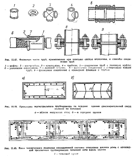 Трубопроводы систем центрального отопления, их размещение (трассировке) и монтажДля систем центрального отопления с теплоносителем водой или паром принимаются стальные неоцинкованные черные водргазопроводные трубы (ГОСТ 3262—62), трубы эдектросварнце (ГОСТ 10704) и трубы бесшовные горячекатаные (ГОСТ 8732—70). Водогазопровидные трубы разделяются по толщине стенки на обыкновенные, усиленные и легкие. Нормальная длина их 6—7 м. Наибольшее применение в технике отопления имеют водогазопронодные трубы обыкновенные. Трубы эцектросварные к бесшовные применяются в основном для магистральных трубопроводов. Соединяются они посредством сварки и с помощью фланцев. Водогазопроводные трубы отличаются более толстыми стенками и наличием да их концах резьбы. Для соединения водогазопроводных труб, изменения их направления или диаметра применяют соединительные части (муфты, тройники, крестовины, футарки). В тех участках трубопровода, в которых может возникнуть необходимость в его разборке, предусматривают разъемное соединение (сгон), представляющее собой кусок трубы длиной 100 или 300 мм с короткой н длинной резьбой и а концах, с навернутой муфтой и контргайкой (рис. 11.47). При соединении и разьединении труб муфта с контргайкой но длинной резьбе перегоняется в соответстнующем направлении. Для уплотнения соединений при теплоносителе с температурой до 100° С используют льняную прядь и пасту, изготовляемую из сурика и олифы. При перегретой воде и паре в качестве уплотнителя применяют асбестовый шнур на графитовой пасте. ![]() Трубопроводы системы отопления подразделяют на магистрали горячей и охлажденной воды при теплоносителе воде и паропровод и конденсатопровод при теплоносителе парс, а также па отопительные стояки и ответвления к приборам. Схемы прокладки магистрального трубопровода системы водяного отопления с верхней разводкой на чердаке здания показаны па рис. II.48. Для монтажа и ремонта трубопровода более удобной является схема прокладки вблизи наружных стен, на расстоянии от них 1 —1,5 м. R отдельных случаях трубопроводы прокладывают под потолком верхнего этажа. При нижней разводке трубопроводы устраивают ниже всех нагревательных приборов, т. с. в подвале, в подполье или в подпольных каналах первого этажа. В зданиях и сооружениях, возводимых в районах Северной климатичсской зоны, прокладка трубопровода на чердаках и в проветриваемых подпольях не допускается. Для типовых жилых домов, состоящих из одинаковых повторяющихся секций, применяется посекционная нижняя разводка, при которой для каждый секции дома осуществляется как бы самостоятельная система (рис. П.49). Трубопроводы прокладывают с уклоном не менее 0,002. В системе водяного отопления с естественной циркуляцией уклон увеличивается ДО 0,005 0,01. Отопительные стояки, как правило, располагают у наружных стен. В угловых помещениях их следует устанавливать в углах, образованных наружными стенами, чтобы предохранить стены от сырости и промерзания. Если стояки и подводки к приборам прокладывают открыто, то расстояние от поверхности штукатурки до трубы должно быть 2—3 см. К стенам стояки крепят разъемными хомутами из полосовой стали. Скрытая прокладка труб (в бороздах) предусматривается для помещений, к которым предъявляются повышенные санитарно-гигиенические и эстетические требования. 