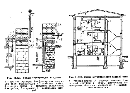 Устройство внутренних газопроводовВводы газопровода в жилые здания (рис. 11.107) устраивают в лестничных клетках, кухнях или коридорах, На вводе газопровода в здание устанавливают запорную арматуру. Вводы газопроводов в насосные и машинные отделения, вентиляционные и лифтовые камеры и шахты, помещения мусоросборников, электрораспределительных устройств, складские помещения не устраивают. Газ подается в квартиры верхних этажей жилых зданий по стоякам, которые прокладывают в кухнях, на лестничных клетках или в коридорах. В жилых помещениях, ванных.комнатах и санитарных узлах их не прокладывают. Если газопровод проходит через стену или перекрытие, его заключают в футляр из стальной трубы. Пространство между футляром и газопроводом заделывают просмоленной прядью и битумом или жирным цементным раствором. Газопроводы внутри здания выполняют из стальных труб, соединяемых на сварке. Резьбовые или фланцевые соединения выполняют только в местах установки арматуры и подключения приборов. Перед каждым газовым прибором, устанавливают краны. Газопроводы в местах прохода людей прокладывают на высоте не менее 2,2 м считая от пола до низа трубы. На стояках и разводящих газопроводах пробки не устанавливают. В общественных и коммунально-бытовых предприятиях можно прокладывать ответвления газопровода к приборам в бетонном полу, но на этом участке газопровода не должно быть запорной арматуры и резьбовых соединений. На рис. 11.108 приведена схема в ну три домовой газовой сети. На схеме показаны газовые, счетчики для учета расхода газа на квартиру. В настоящее время газовые счетчики в квартирах жилого дома не устанавливают, а расчет за газ производят по числу жильцов. Опасные и токсические свойства газа заставляют предъявлять особые требования также к помещениям, где устанавливают газопотрсбляющие приборы. ![]() Присоединение газовых водонагревателей и других газовых приборов к дымоходам необходимо выполнять трубами, изготовленными из кровельной Стали. Суммарная длина горизонтальных участков соединительной трубы во вновь строящихся зданиях должна быть минимальной (пе более 3 м), а длина вертикального участка — возможно больше (не менее 0,5 м). Отвод продуктов сгорания газа от бытовых газовых приборов, печей и другого газового оборудования, в конструкции которого предусмотрен отвод продуктов сгорания в дымоход, следует предусматривать раздельно, т. е. по обособленным дымоходам. |
